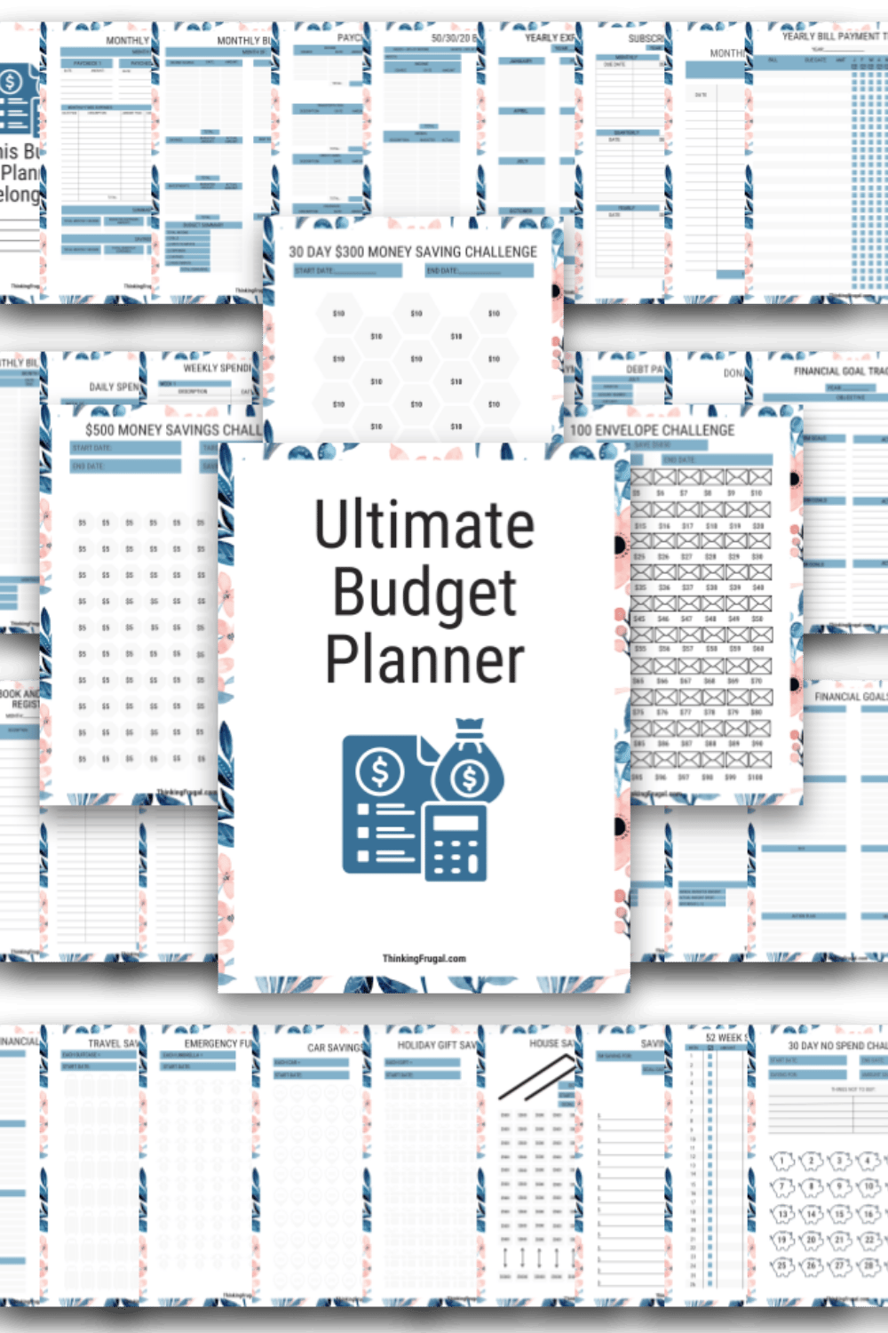 - This bundle includes 40 total pages. Includes cover page, belongs to page, 2 different monthly budget pages, paycheck budget 50/30/20 budget, yearly expense tracker, subscription tracker, monthly income tracker, yearly bill payment tracker, monthly bill tracker, daily spending tracker, weekly spending tracker, monthly spending tracker, debt snowball tracker, debt payment tracker, donation tracker, financial goal tracker, checkbook/debit card register, savings account tracker, emergency fund tracker, sinking funds tracker, retirement funds tracker, vacation budget, birthday gift budget, Christmas/holiday gift budget, financial goals tracker, travel savings tracker, emergency fund tracker, car savings tracker, holiday gift savings tracker, house savings tracker, savings tracker, 52-week savings challenge, 30-day no spend challenge, $500 money savings challenge, 100 envelope challenge, and 30-day $300 money savings challenge.
