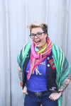 Initium is a fun, flashy asymmetrical garter stitch crescent shawl with short row stripes and a centred point on the bottom border.