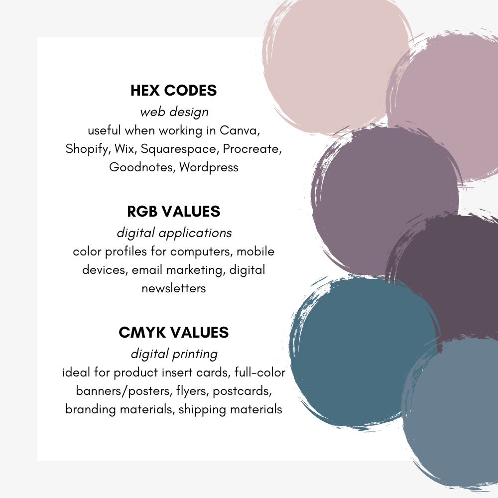 + Detailed Hex Codes, RGB, and CMYK values for each color