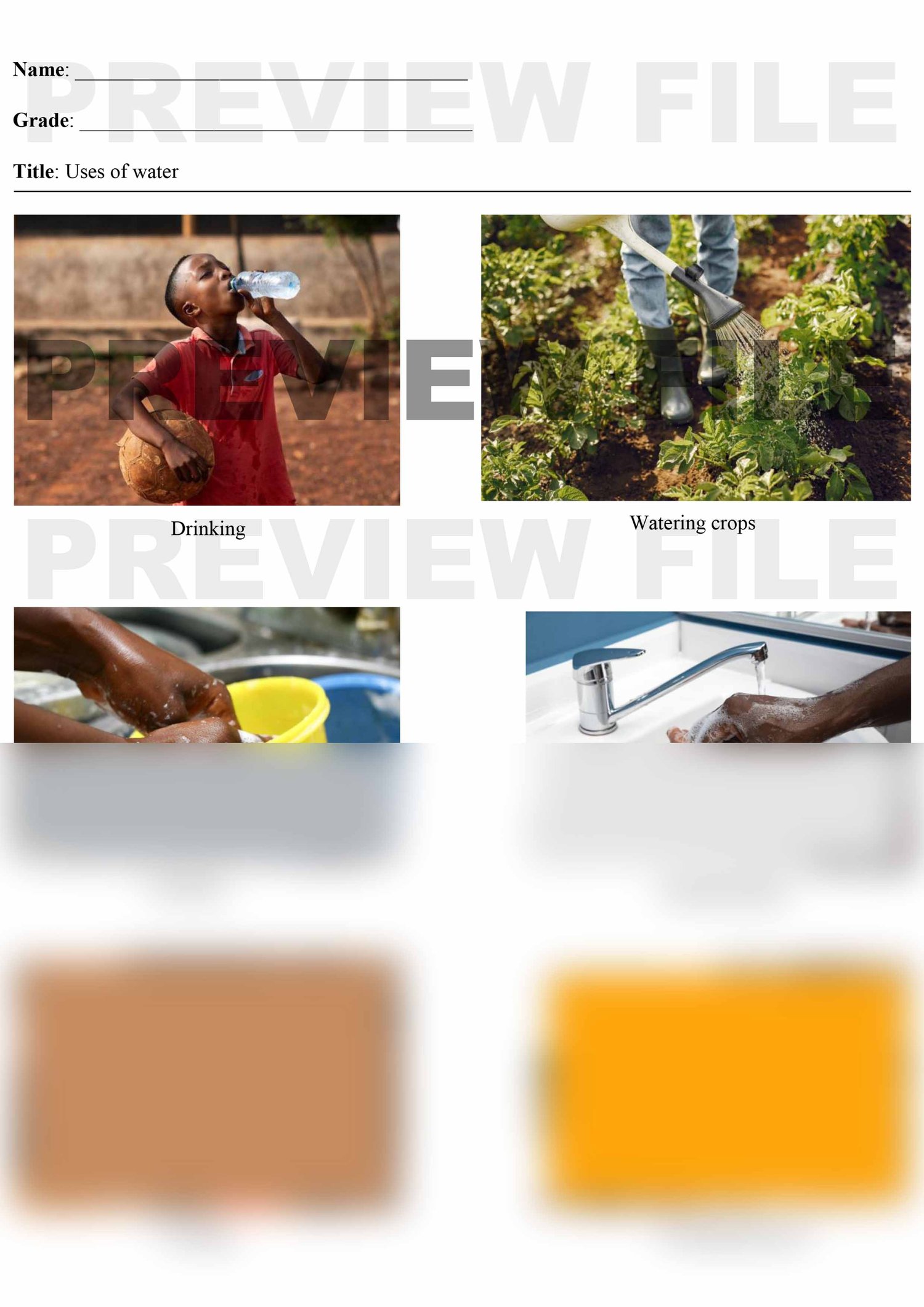 Water is essential for life and is used for various uses; for example, cooking, drinking, washing hands, e.t.c. This file has clear pictures of different uses of water.