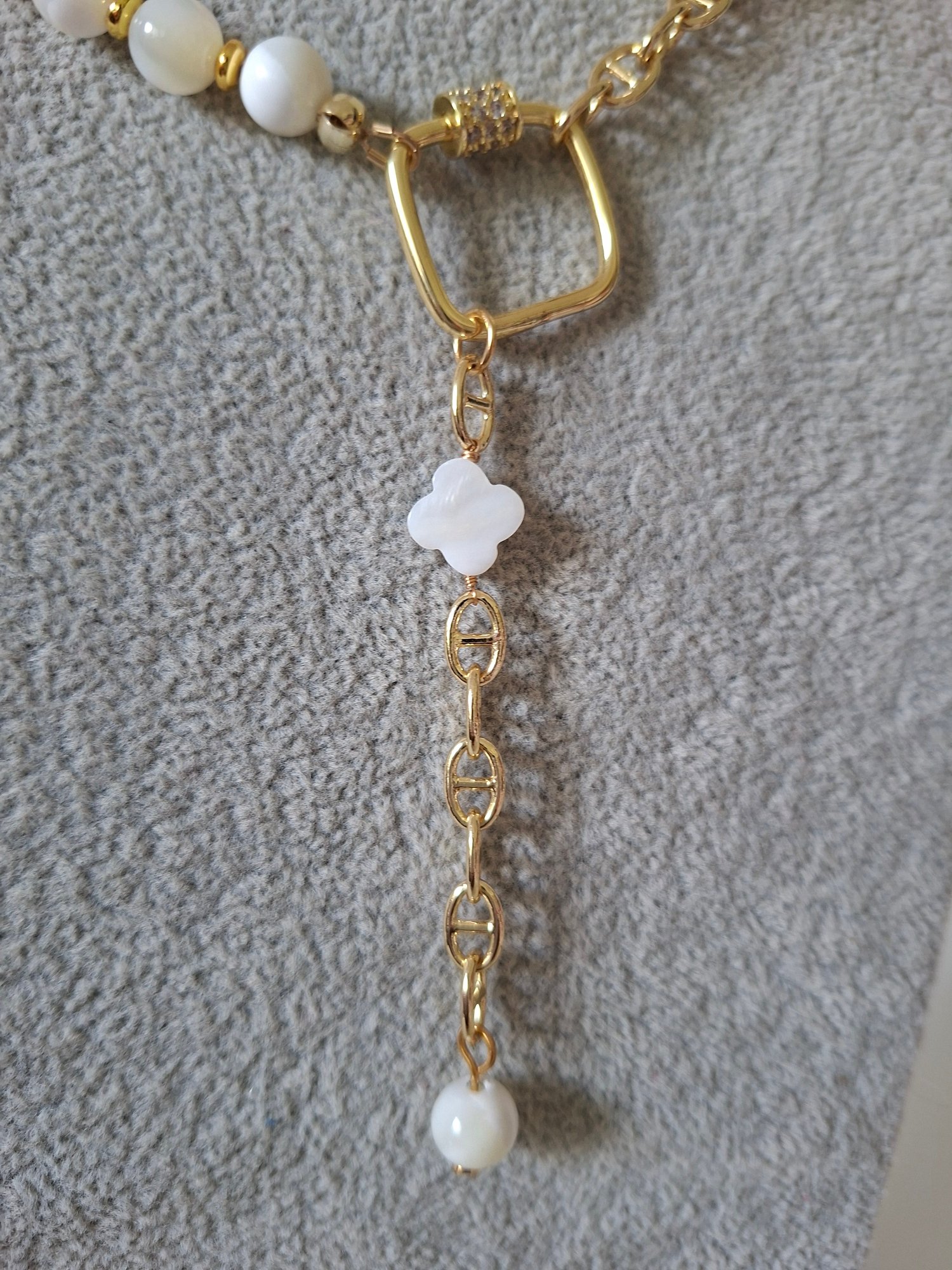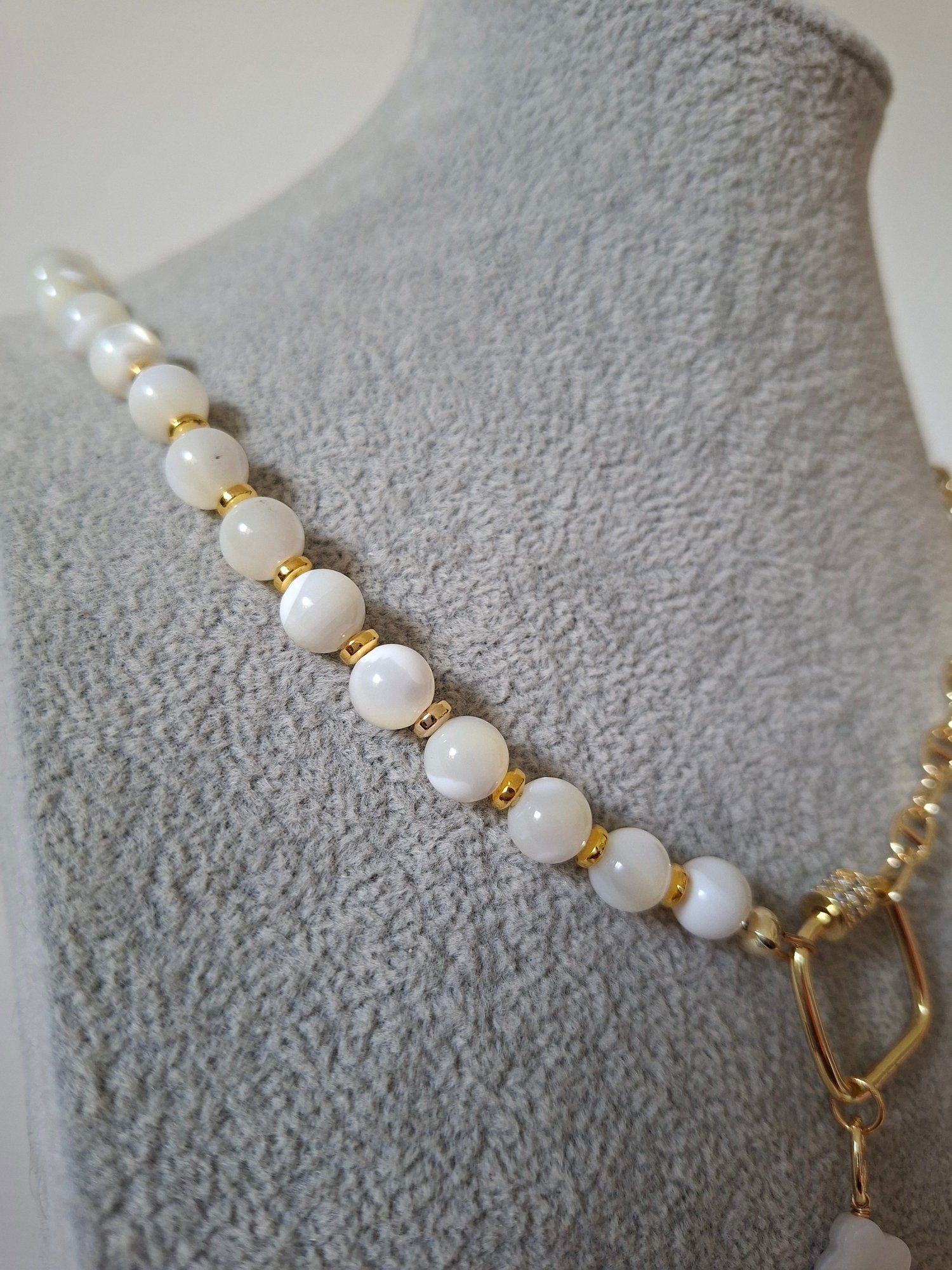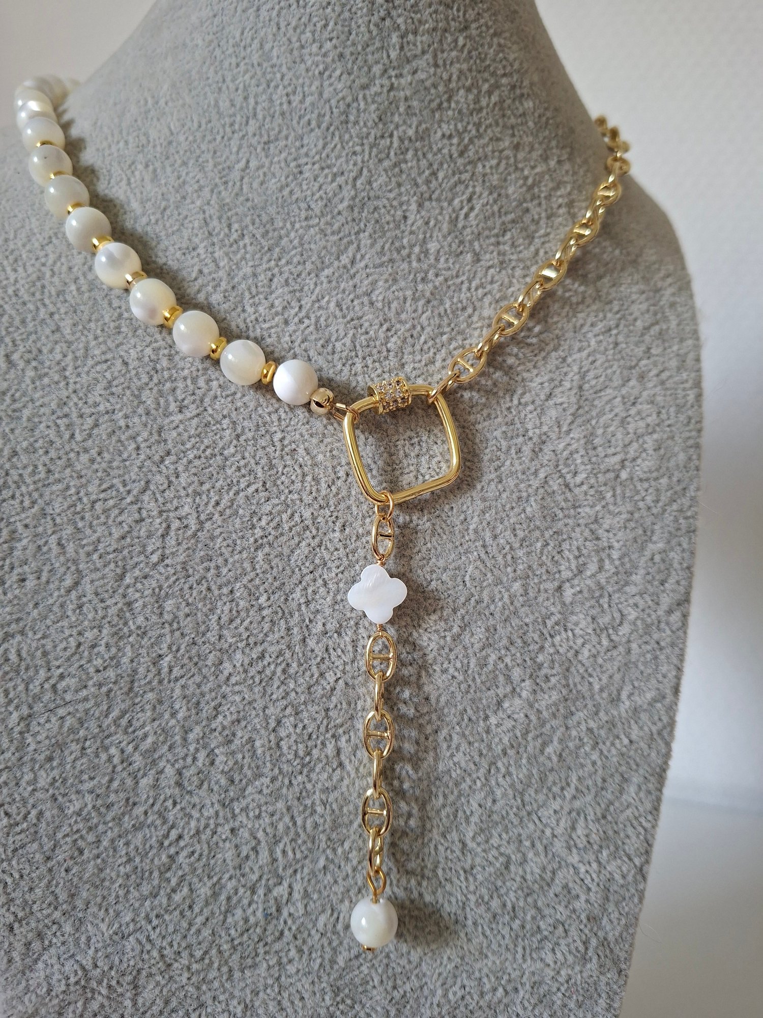 Un collier élégant et raffiné qui marie la douceur des perles de nacre et l’éclat d’une chaîne dorée. Sa touche originale : une chaîne descendante ornée d’un petit nuage en nacre et d’une perle finale, pour un bijou à la fois moderne et intemporel.