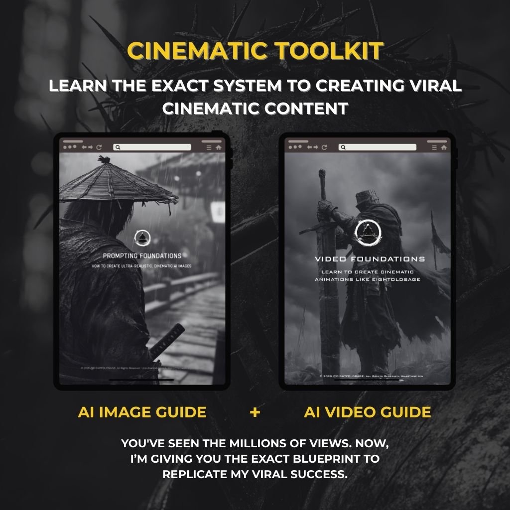 The Cinematic Toolkit is the exact two-part workflow used to build the @eightfoldsage aesthetic. This exclusive bundle includes TWO complete PDF guides that hand you the keys to a digital film studio. It combines Prompting Foundations and Video Foundations to take you from a blank screen to a viral video.