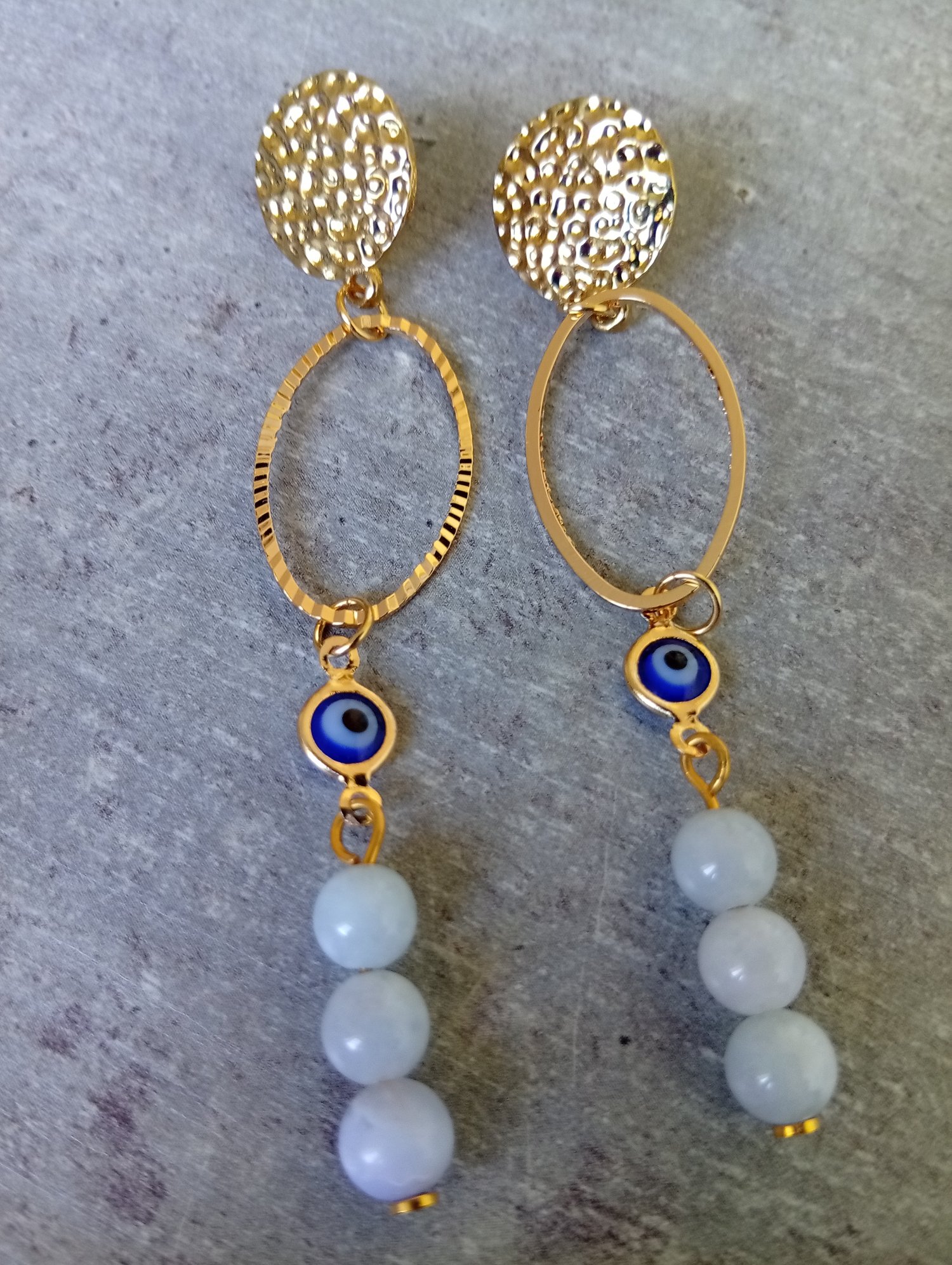 Boucles d’oreilles pendantes en aigue-marine, finition dorée, ornées d’un pendentif œil protecteur bleu et d’un grand anneau martelé. Une création élégante et symbolique, qui allie sérénité, protection et communication fluide.