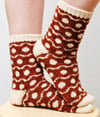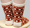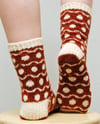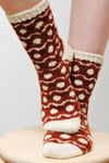 Soft Spots are worked from the toe up in two colors of sport-weight yarn. The socks are available in two sizes: 48 and 64 stitches.