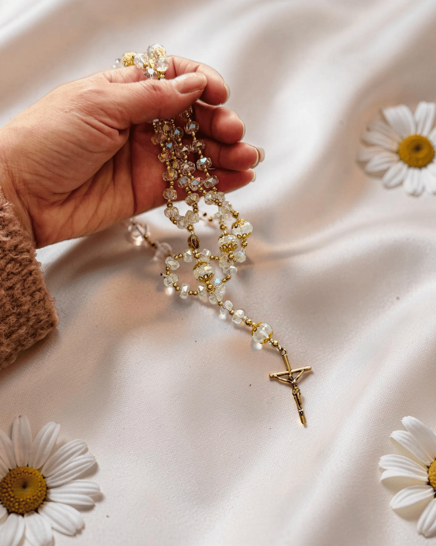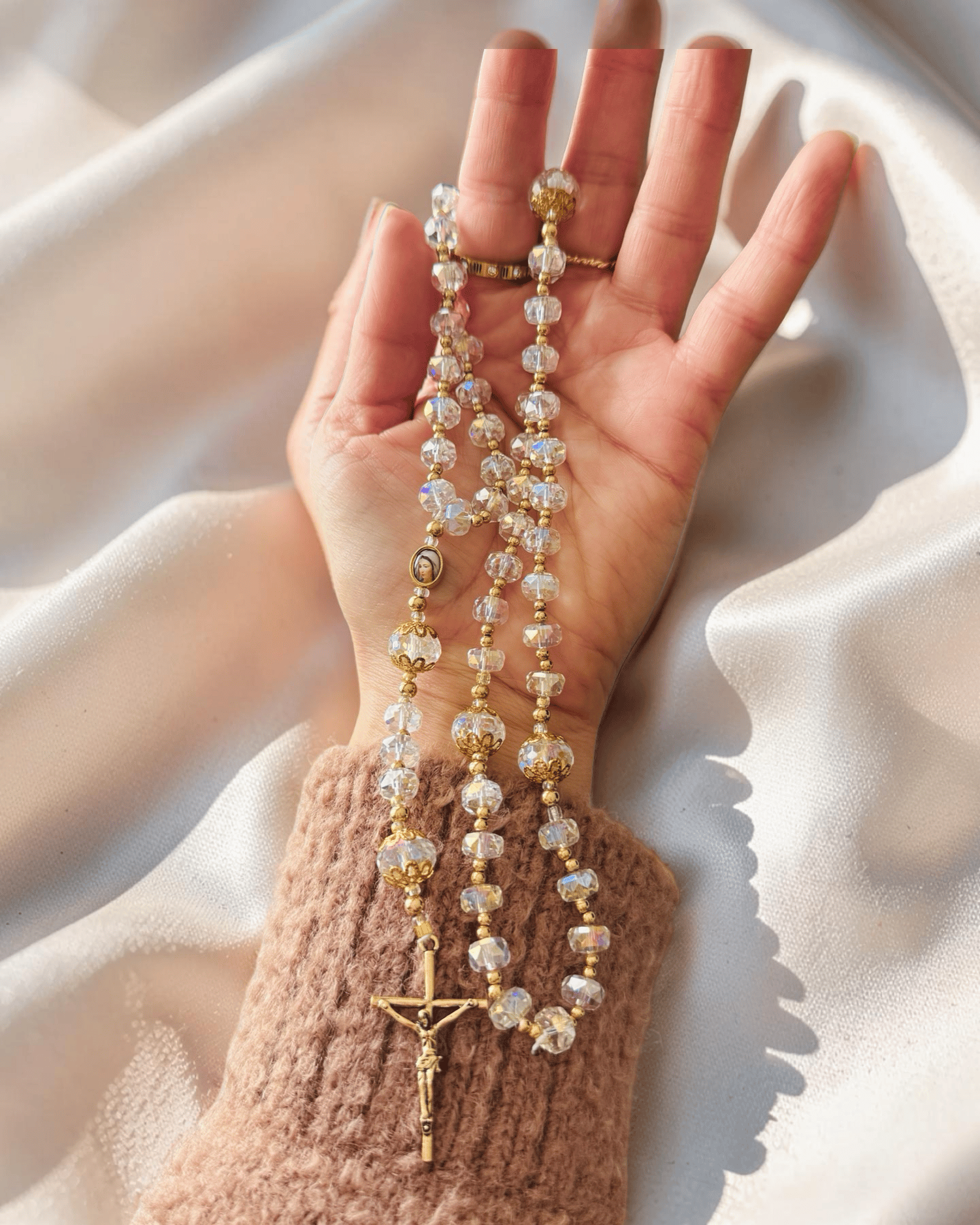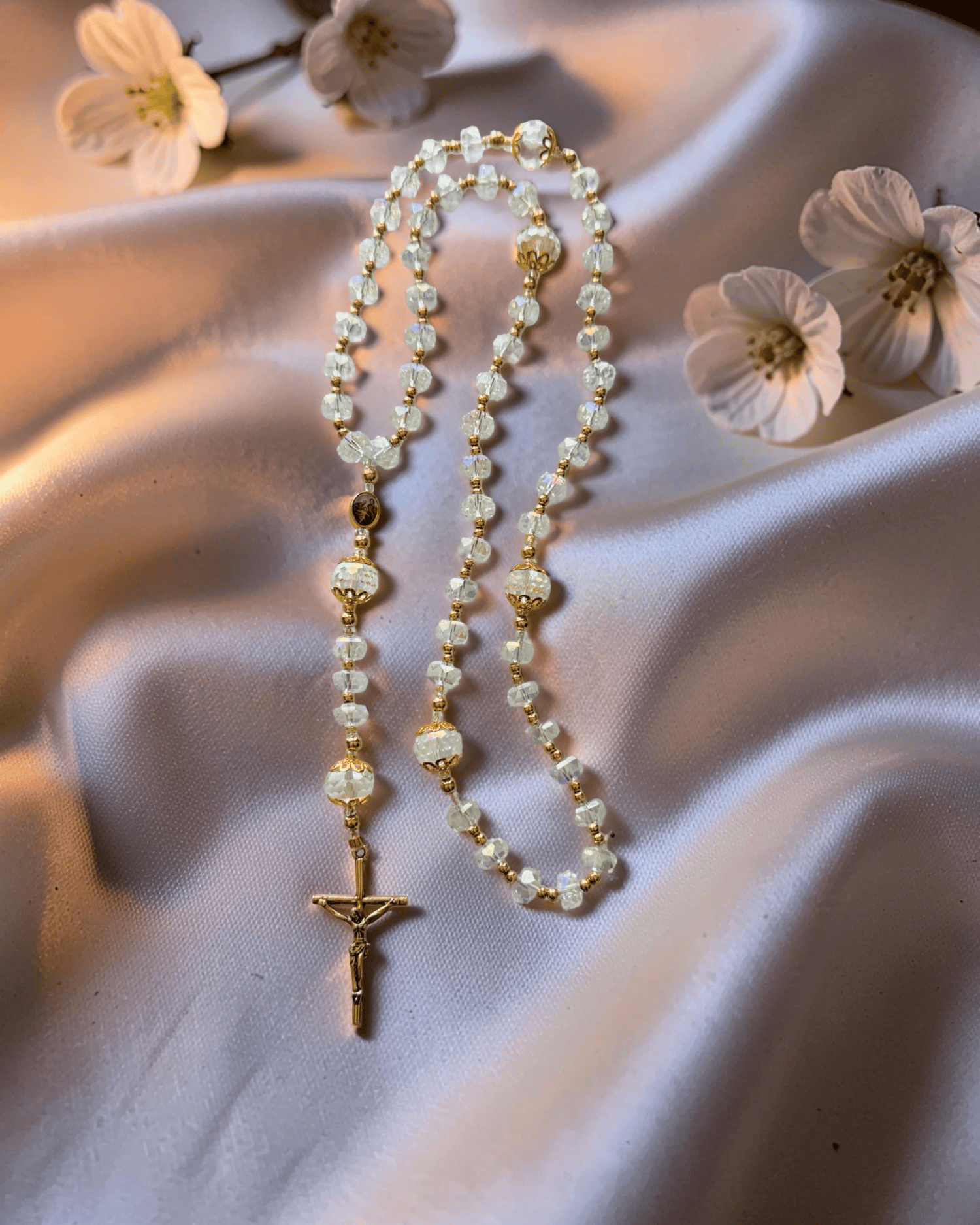 Keywords: crystal rosary, AB crystal rosary, gold rosary, wedding rosary, bridal rosary, First Communion rosary, aurora borealis rosary, handmade cord rosary, elegant rosary, luxury rosary