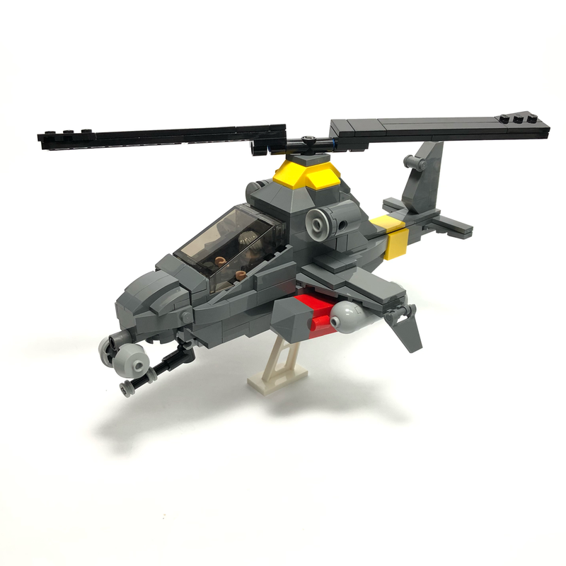 This is my minifigure-scale recreation of the helicopter and has several features such as the rotating rotor blade, removable windscreen, rotating gatling gun and includes the bombs and fuel tanks also.