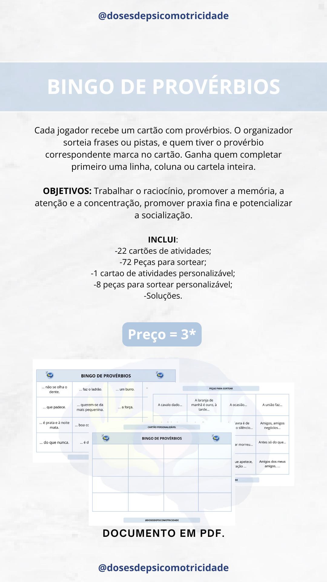 Cada jogador recebe um cartão com provérbios. O organizador sorteia frases ou pistas, e quem tiver o provérbio correspondente marca no cartão. Ganha quem completar primeiro uma linha, coluna ou cartela inteira.