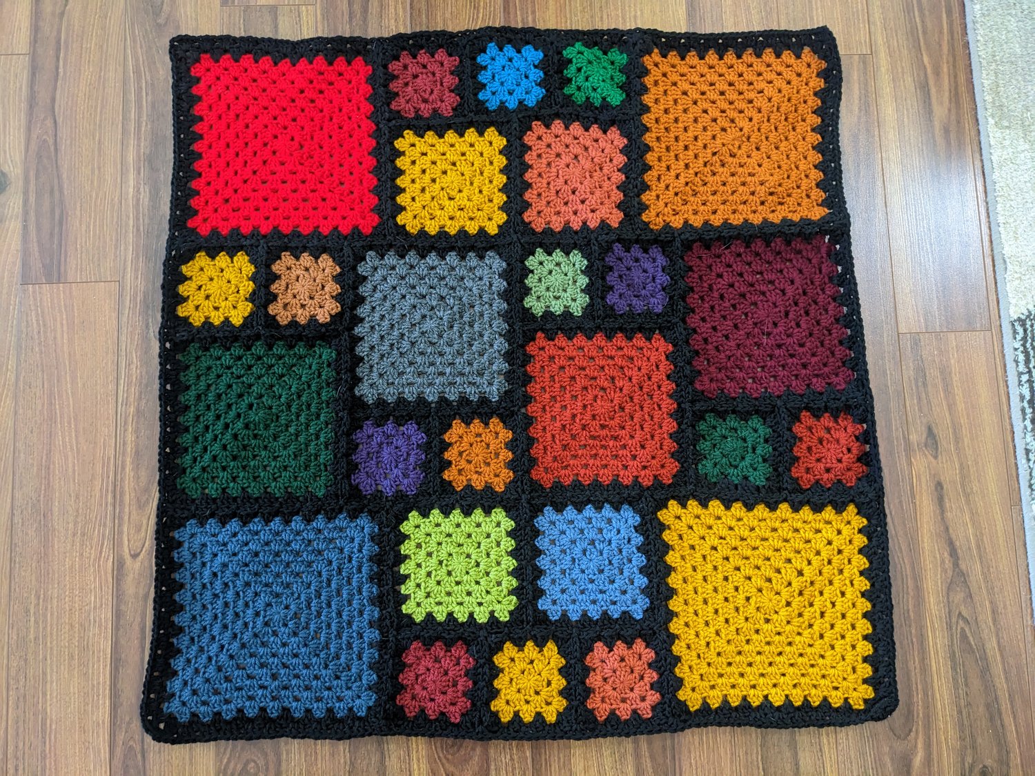 Finished size: is approximately 6.5 times bigger than your 5-round square. Sample measures 35” square.