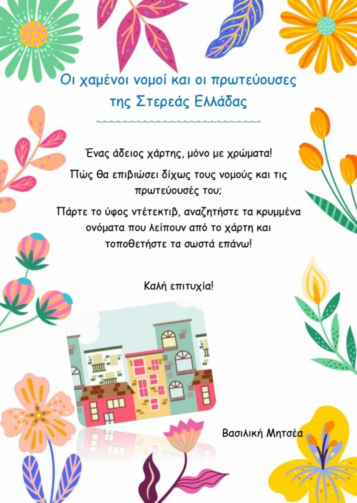 Ένας άδειος χάρτης, μόνο με τα χρώματά του, δίχως νομούς και πρωτεύουσες. Πώς θα καταφέρει να επιβιώσει; Ένα μοναδικό παιχνίδι για να μάθουν τα παιδιά μας τους νομούς και τις πρωτεύουσες της Στερεάς Ελλάδας. Πώς; Μα μέσα από το παιχνίδι, φυσικά!
