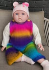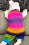 These cute, warm and cosy, baby overalls, button at the shoulders. The wonderful colours in this yarn adds visual interest to this easy knit design, and makes each pair of overalls unique.