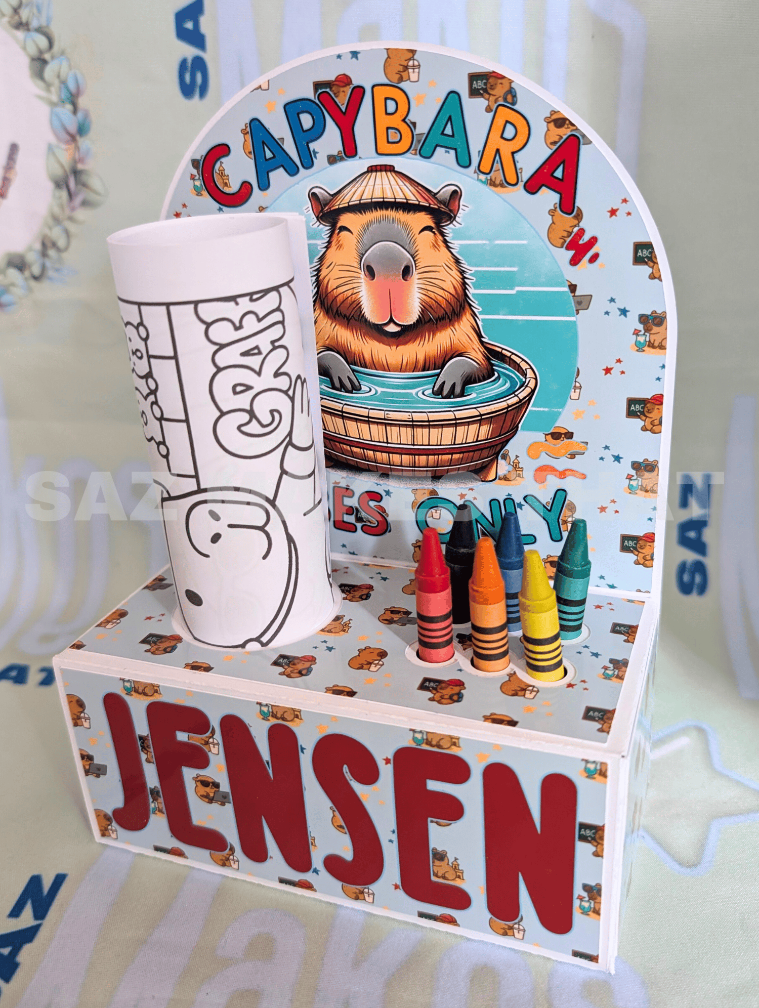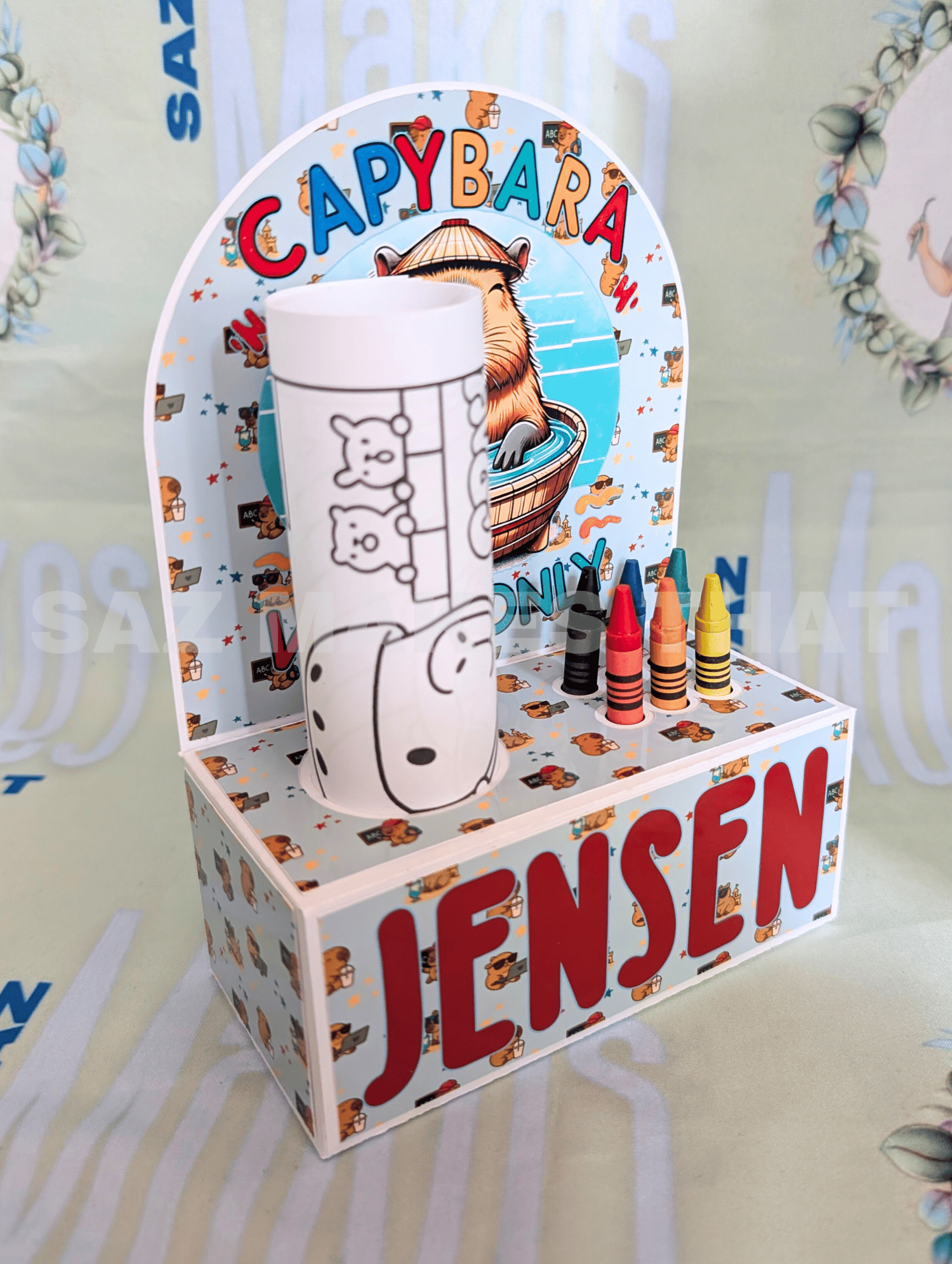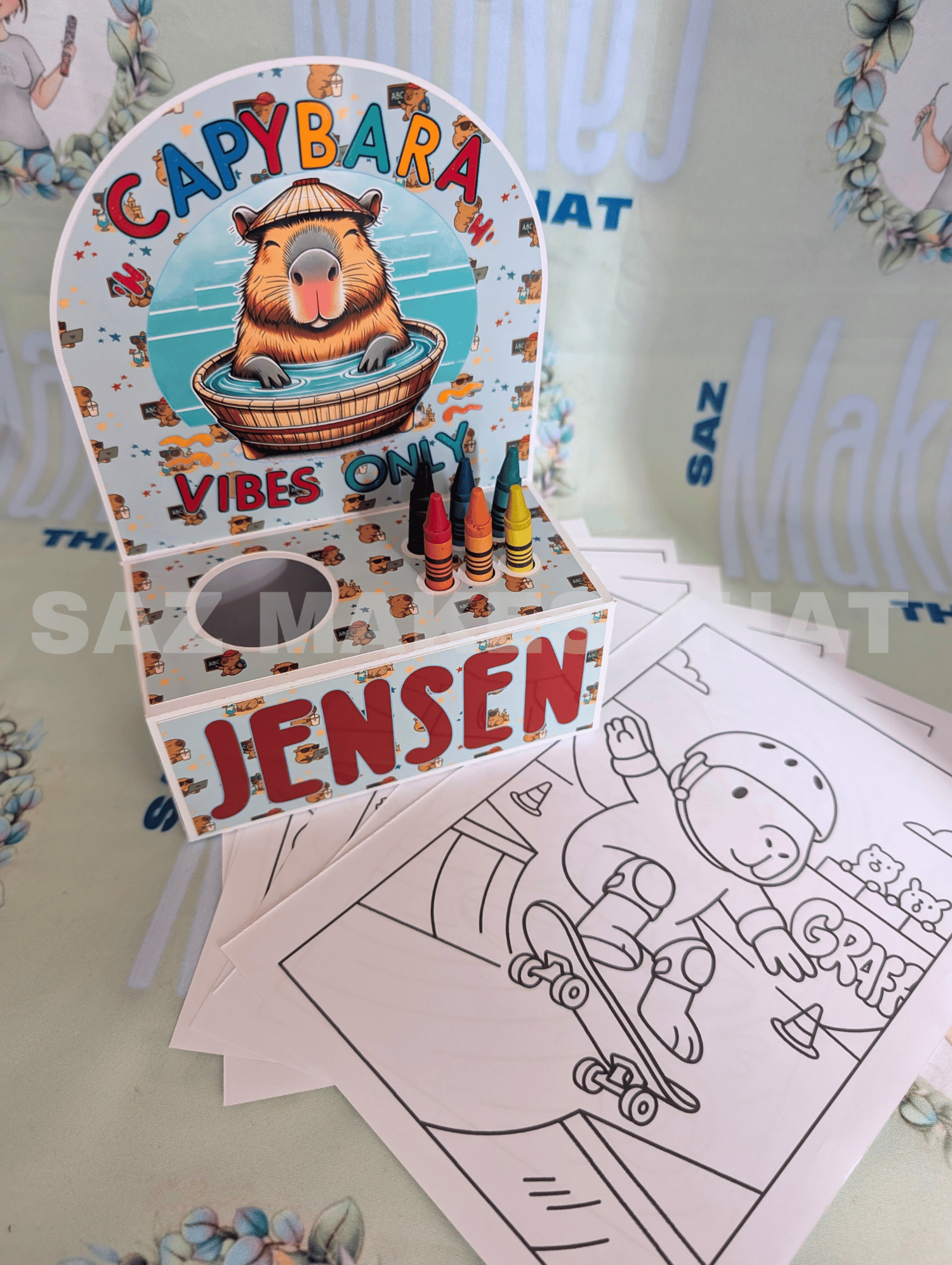 the file holds 6 crayons and I used A5 sized colouring pages. You can personalise with images and text for print then cut or just cut from plain or patterned card.