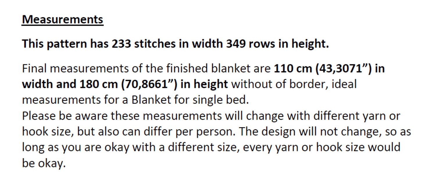 For this pattern, my tester Denice Kunniger used a 4 mm hook (US-G/6, UK-8) and the measurements with the recommended yarn (Styekraft Special DK) were 110 cm (43,3071”) in width and 180 cm (70,8661”) in height without of border, ideal measurements for a Blanket for single bed.