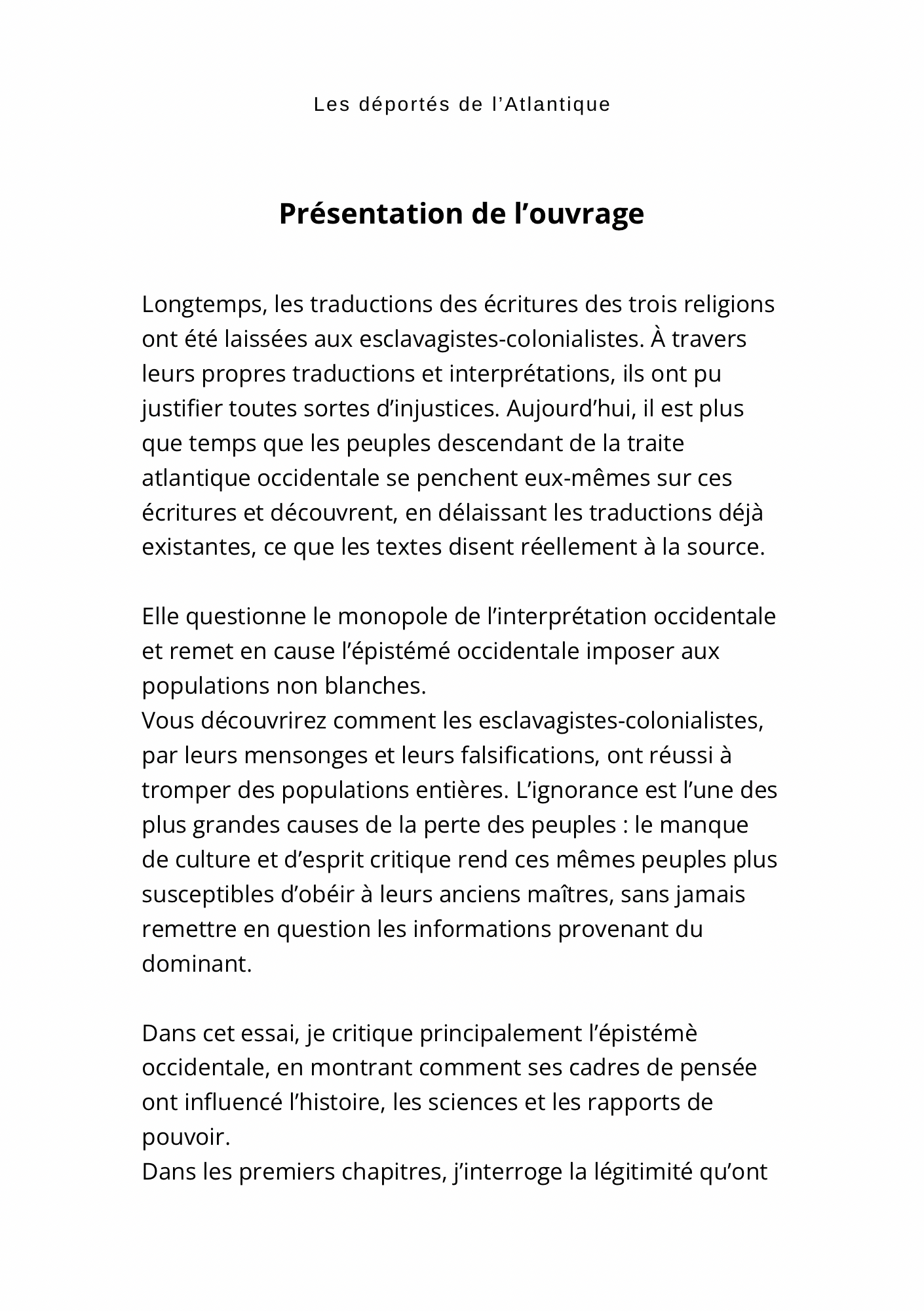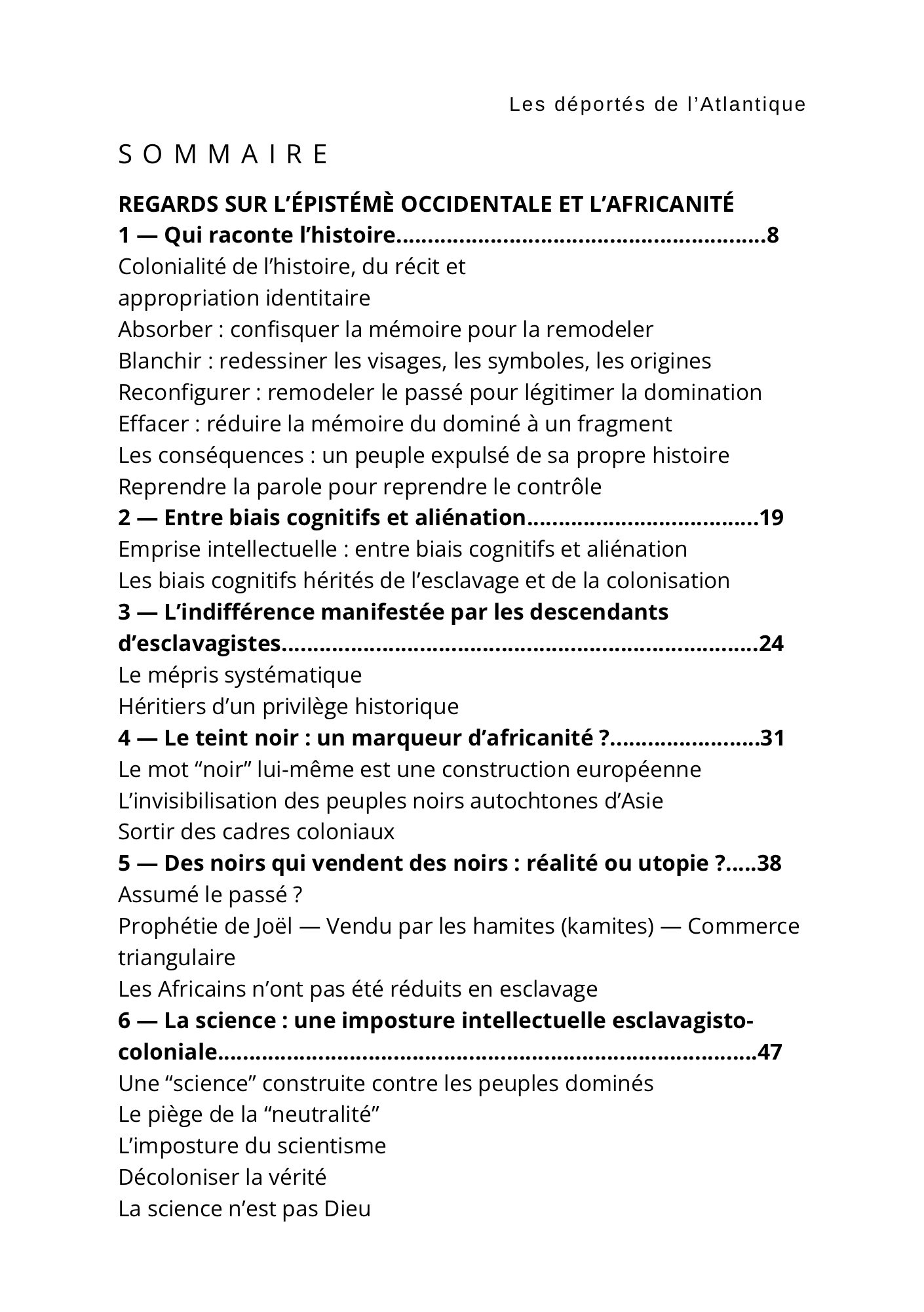 L’autrice dénonce par ailleurs l’hypocrisie des sciences modernes et la complicité des tests ADN dans la perpétuation du récit colonial, tout en analysant le rôle de la religion chrétienne comme instrument de domination intellectuelle.