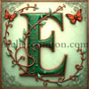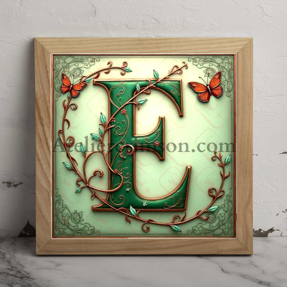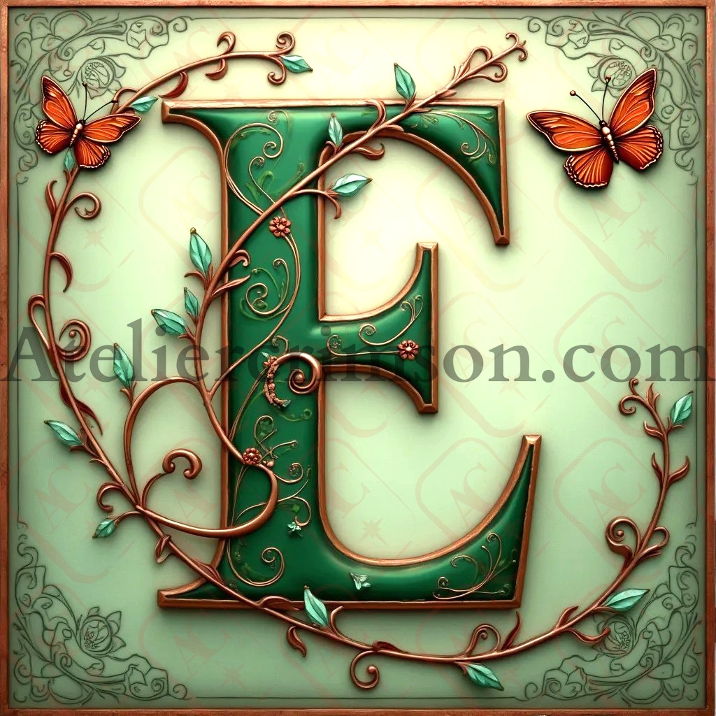 The letter E emerald and copper Art Nouveau Intricate design with floral patterns, butterflies, and vines. Elegant sage green background. Perfect for vintage lovers and typography enthusiasts.