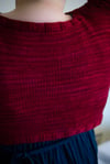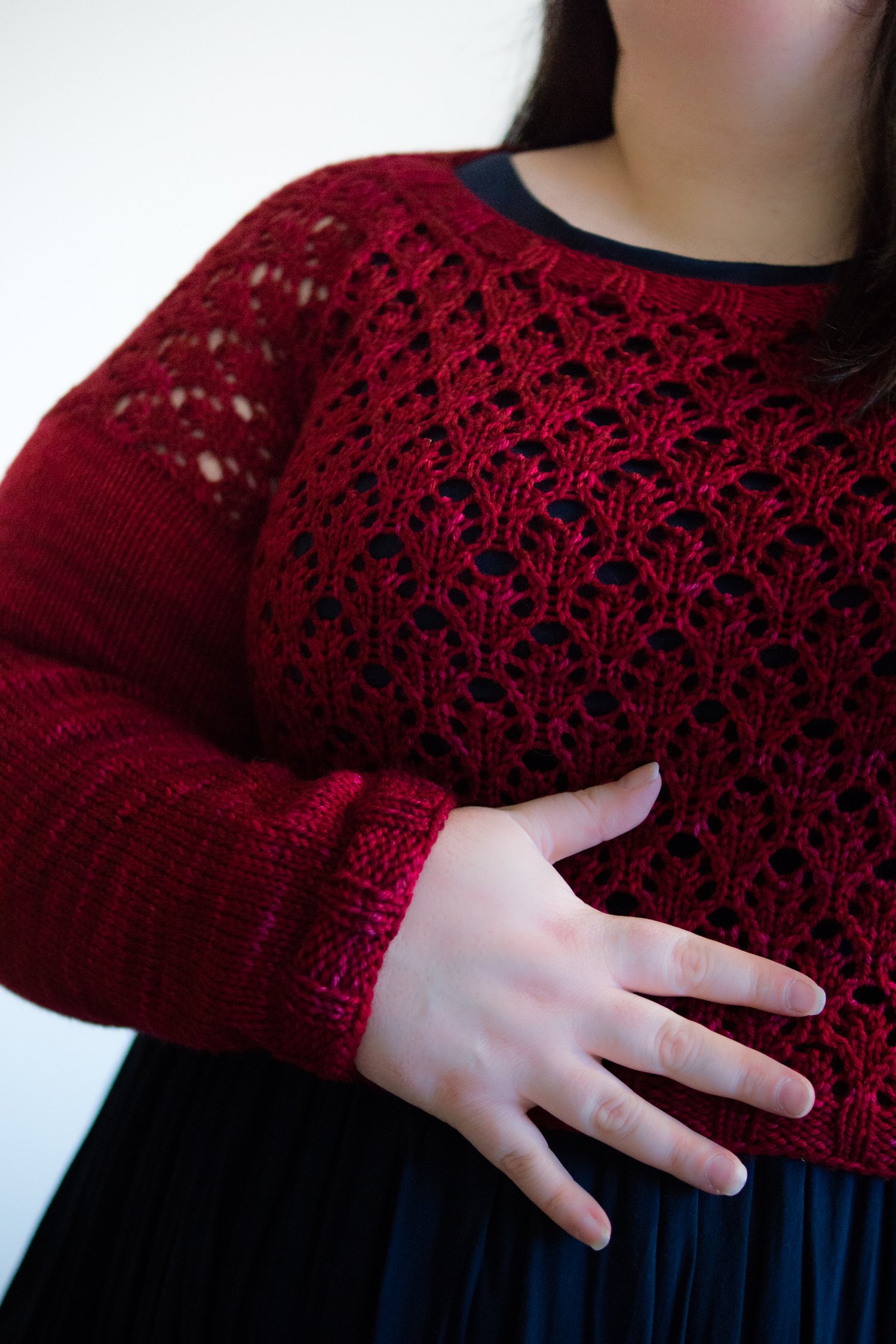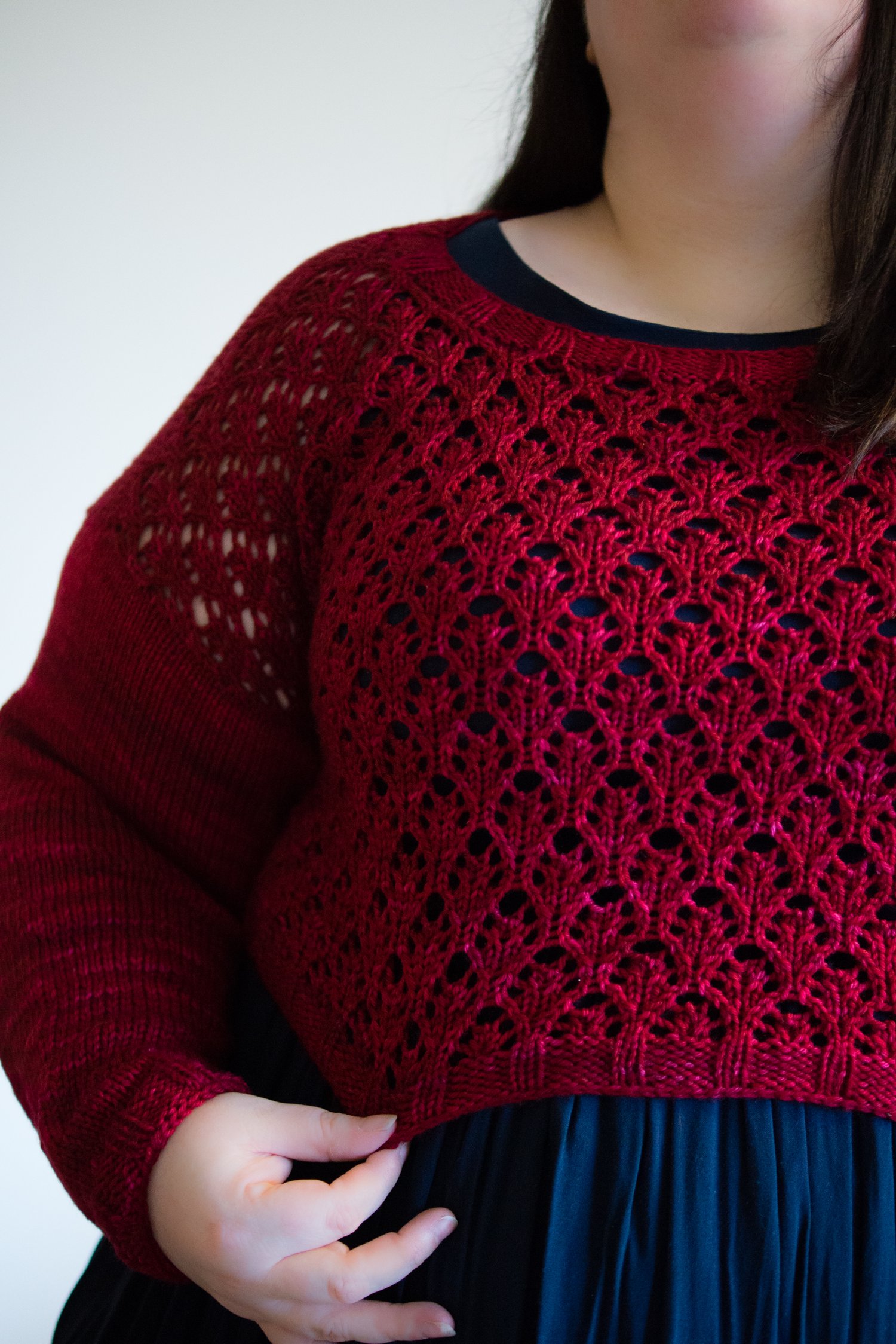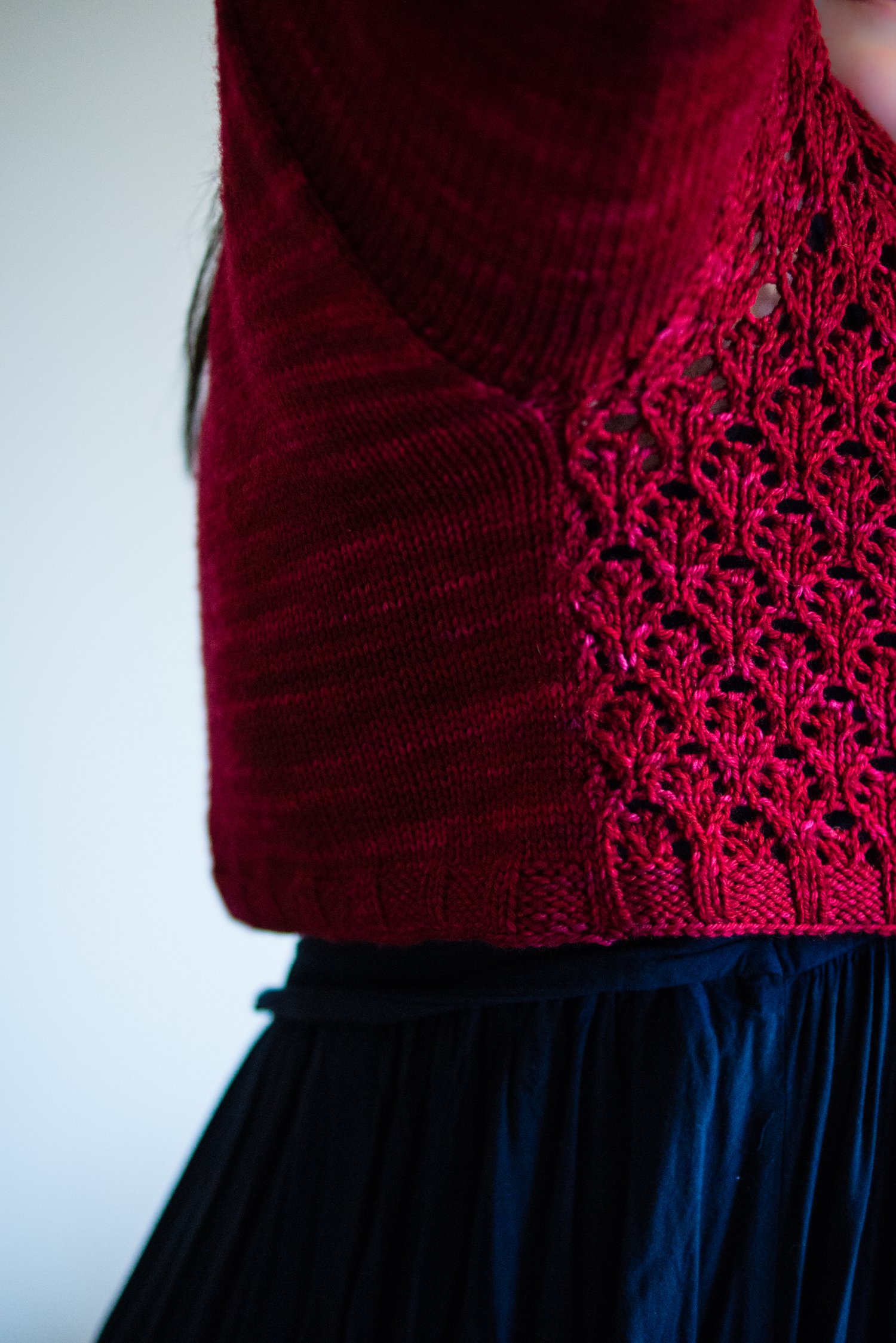 Techniques: cast on (long tail, backwards loop); bind off (standard); knitting flat; knitting in the round; lace; picking up stitches; mattress stitch