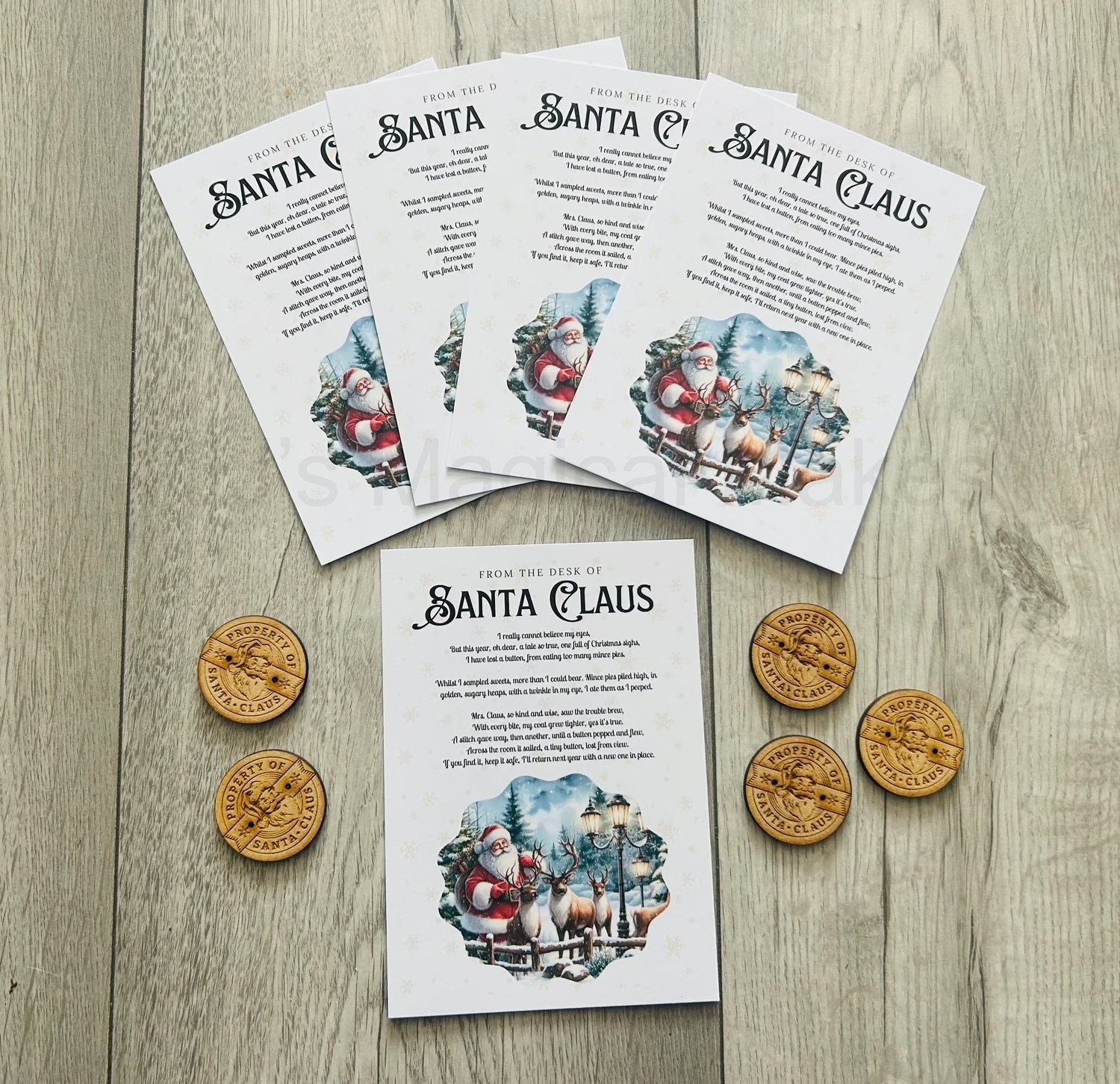 Santa’s lost button. Backing card A6 in size. Button can come in plain, silver and gold.