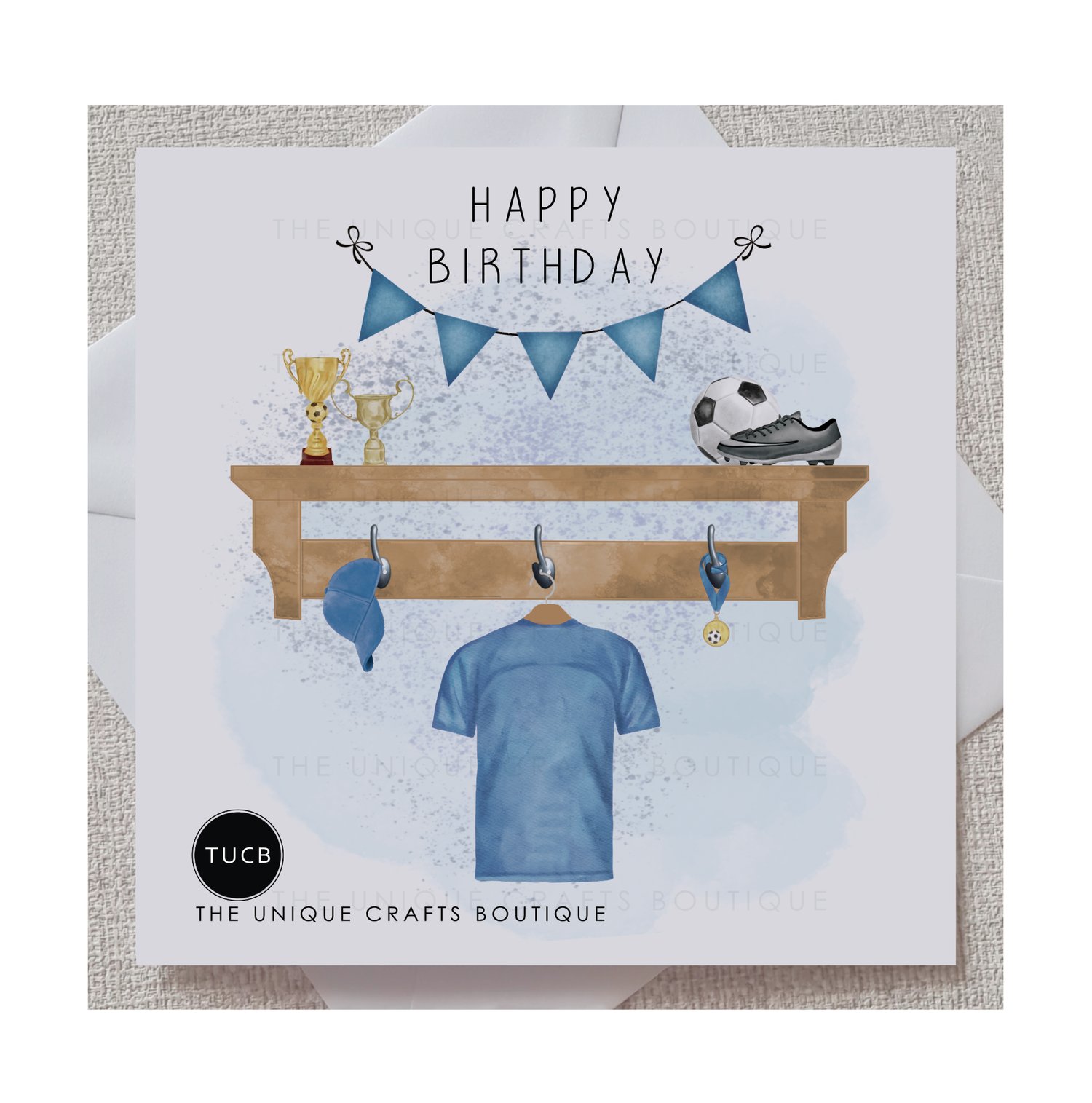 Printed with a cute watercolour football T-shirt and accessories. The message 'happy Birthday' is displayed across the top. This card is certain to make any football fan smile.