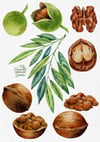 Walnuts. Green immature walnuts, ripe walnuts, walnut kernels, leaves and twigs, bottle of walnut oil