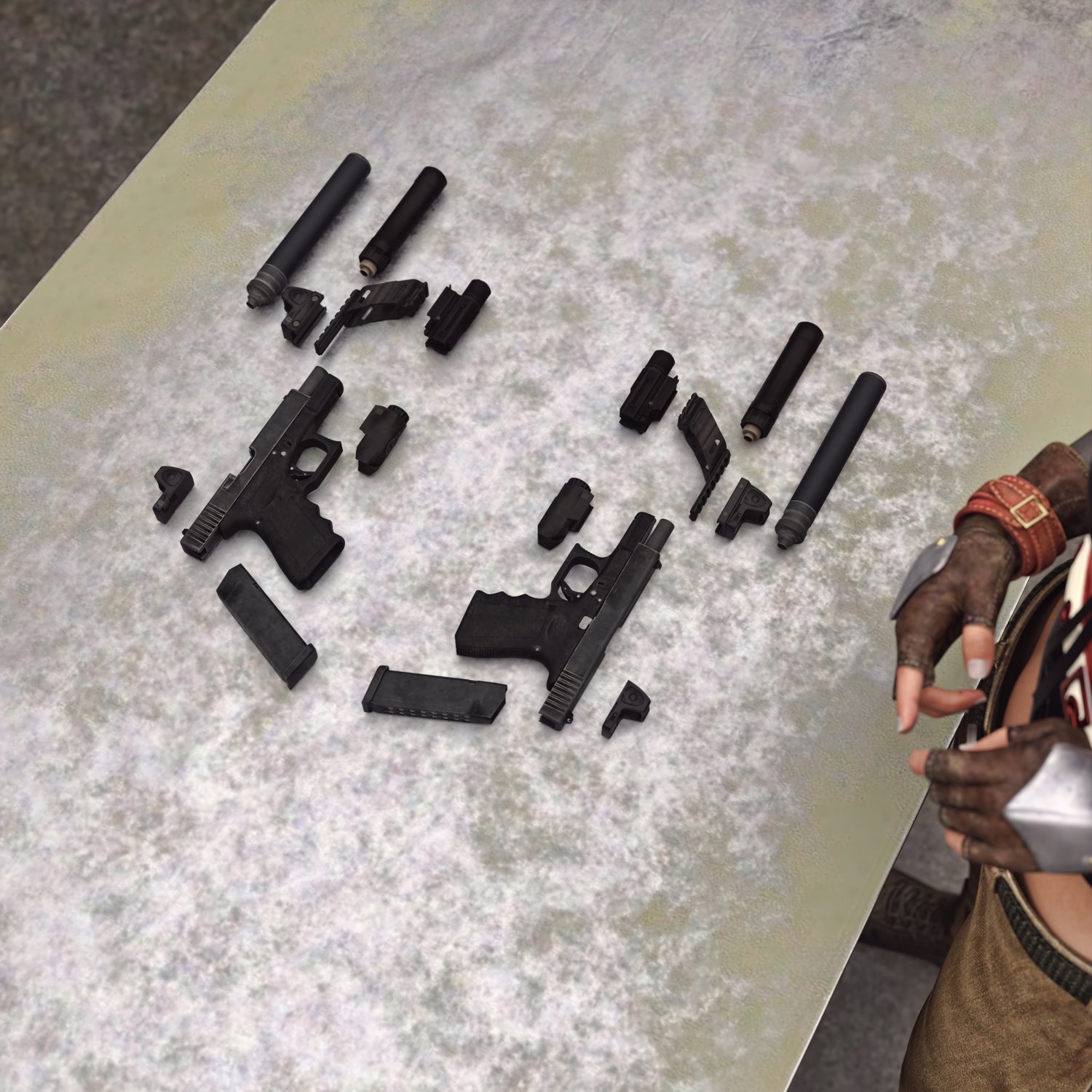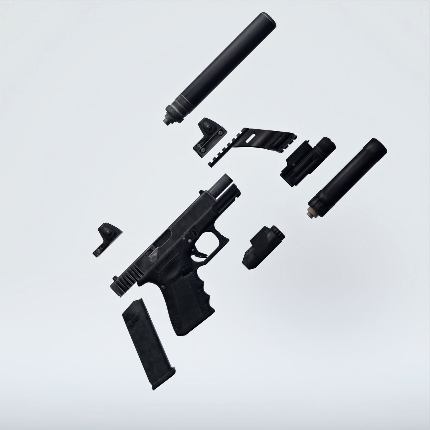 Probably the most famous striker fired pistol. Includes various attachments so you can configure it in many ways- from the simple pistol with no attachments to a tactical silenced tool. Converted and rigged for use in Daz, so you can make more realistic pictures, with moving slide, pulled trigger etc.
