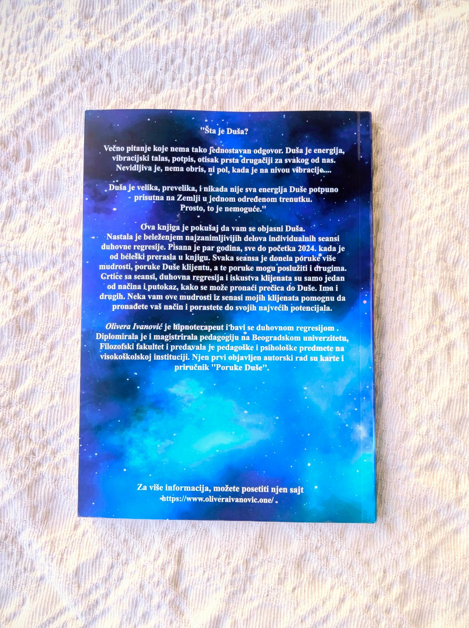 ‘’Šta je Duša? Večno pitanje koje nema tako jednostavan odgovor. Duša je energija, vibracijski talas, potpis, otisak prsta drugačiji za svakog od nas. Nevidljiva je, nema obris, ni pol, kada je na nivou vibracije.... Duša je velika, prevelika, i nikada nije sva