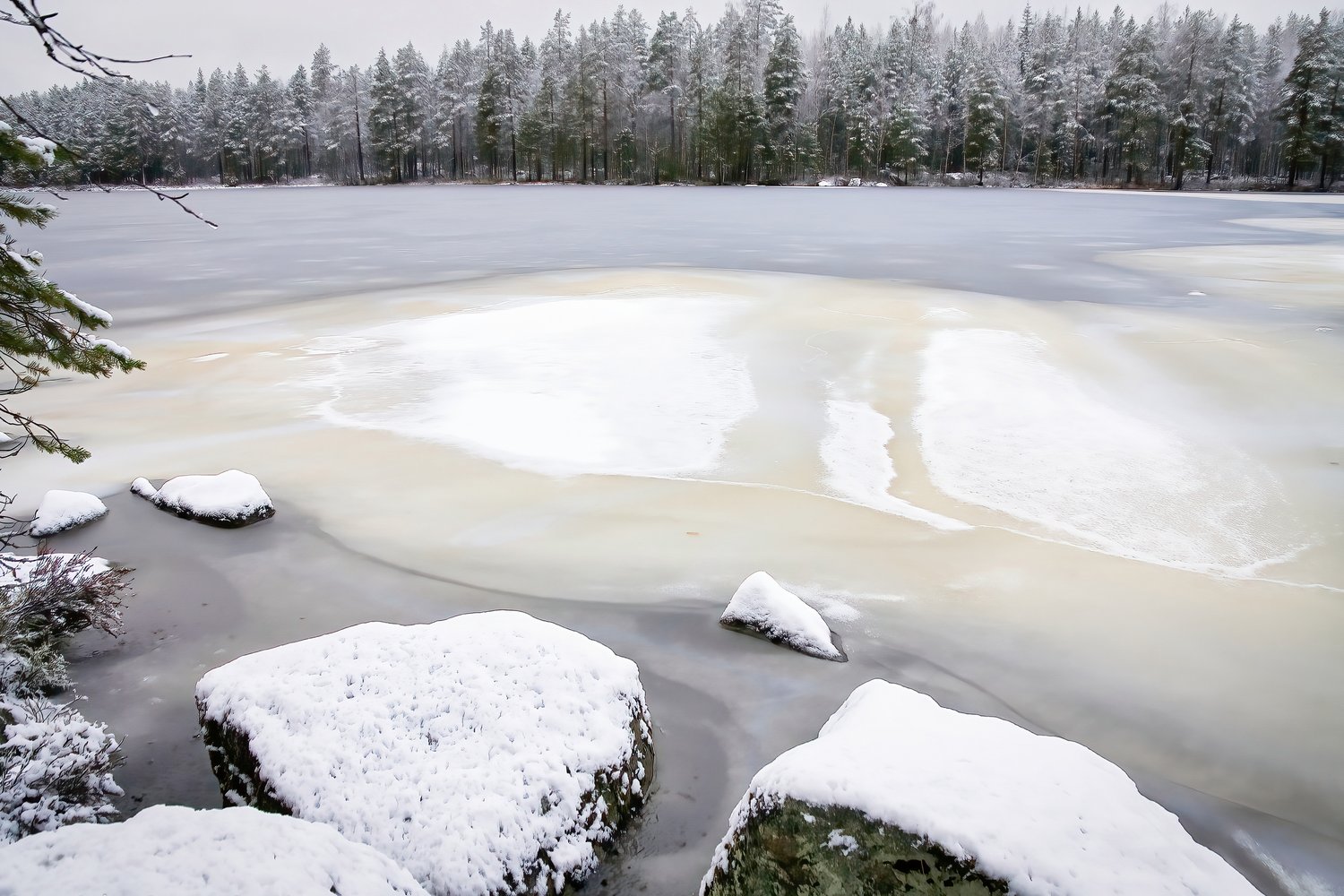 Forest lake On the gray day of December. The lake is already almost frozen.