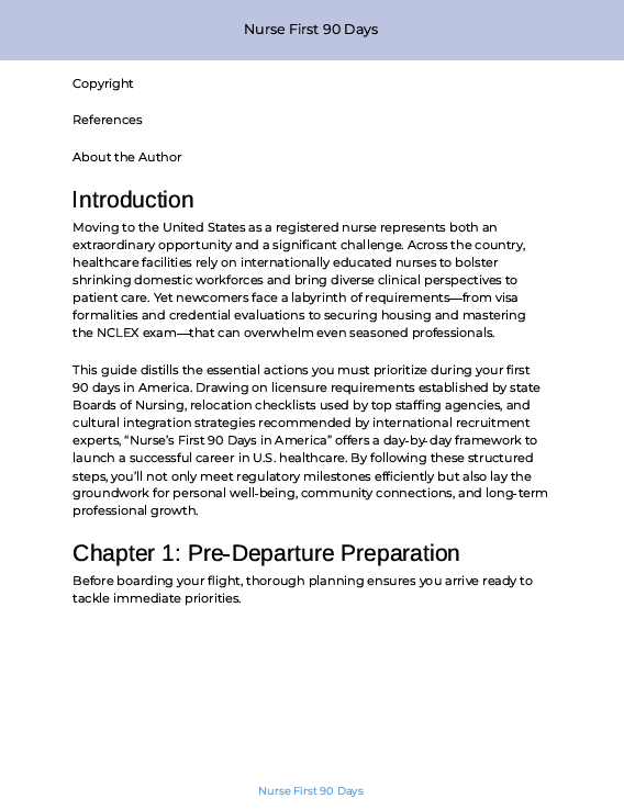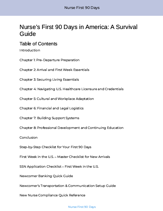 "Nurse First 90 Days" is your essential roadmap for successfully navigating the complexities of starting a nursing career in the U.S. This comprehensive guide provides a structured, day-by-day plan covering everything from securing your license and housing to mastering the cultural nuances of American healthcare. With invaluable insights from industry experts, you’ll transform initial challenges into stepping stones for a fulfilling professional journey.