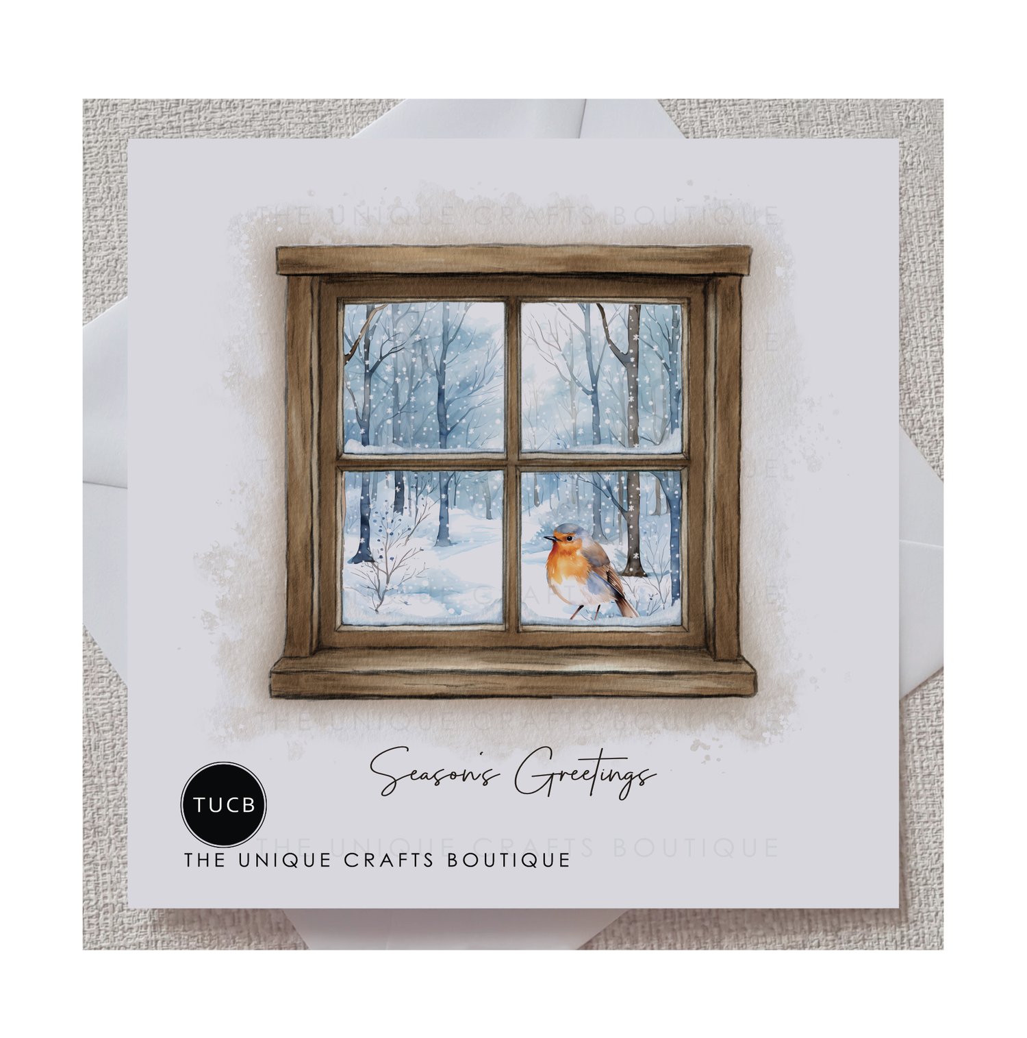 A sweet little Robin is sat outside on the ledge looking in with The message 'Season's Greetings' displayed below.