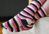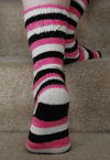 I love knitting with self-striping sock yarn, but sometimes it doesn’t play so nicely with stitch patterns -- and let’s be honest, there’s only so many plain stockinette socks one can knit before getting bored. These socks arose from a desire to do something interesting and unusual with a skein of self-striping yarn (though they’d look just as nice in a solid, semisolid, or variegated yarn).