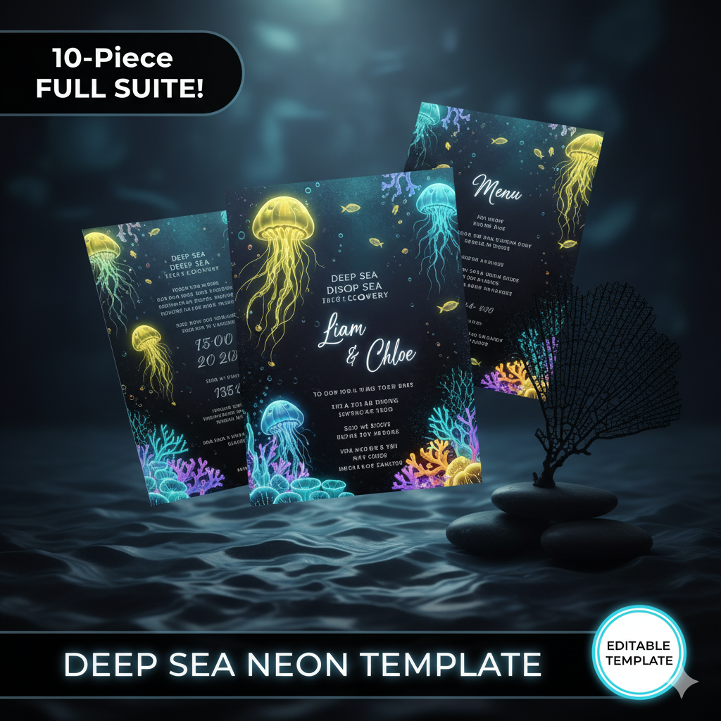 MYSTICAL Deep Sea 10-Piece Neon Wedding Suite | Bioluminescent Ocean Theme | Editable Template