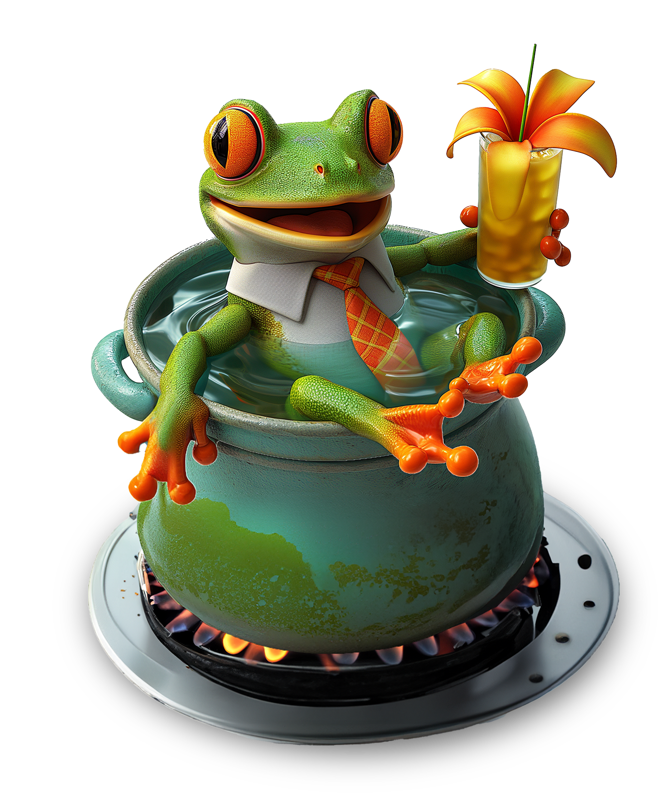 Visualize the business metaphor of the boiled frog through a captivating 3D illustration. In this clipart, a green cartoon frog with orange eyes leisurely relaxes in a cooking pot on a stove. Sporting a business tie and holding a tropical fruit drink, the frog appears blissfully unaware, resembling a vacationer enjoying a hot tub.