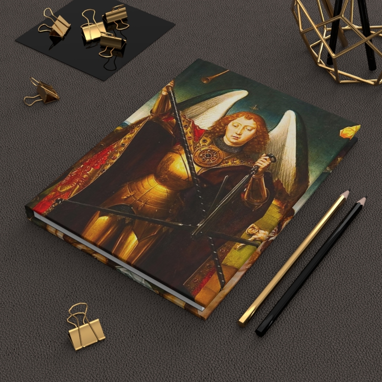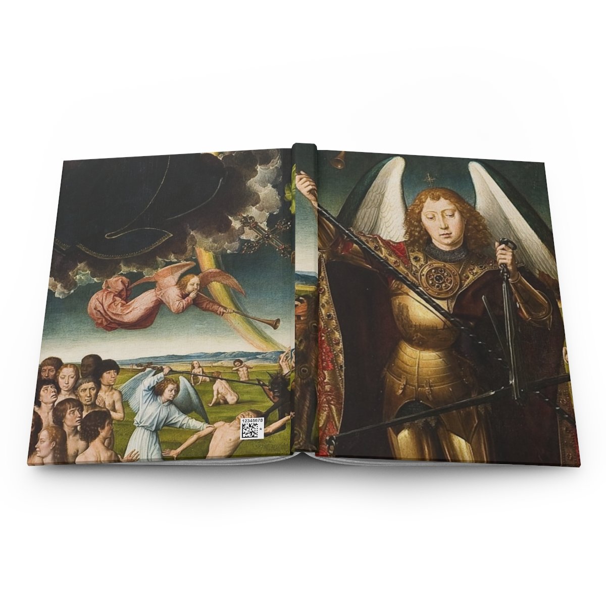 An elegant lined blank notebook featuring a full colour reproduction, front and back, of the St. Michael the Archangel, a detail of the great Last Judgement painting, a famous masterwork altarpiece by the 15th century Flemish painter Hans Memling.