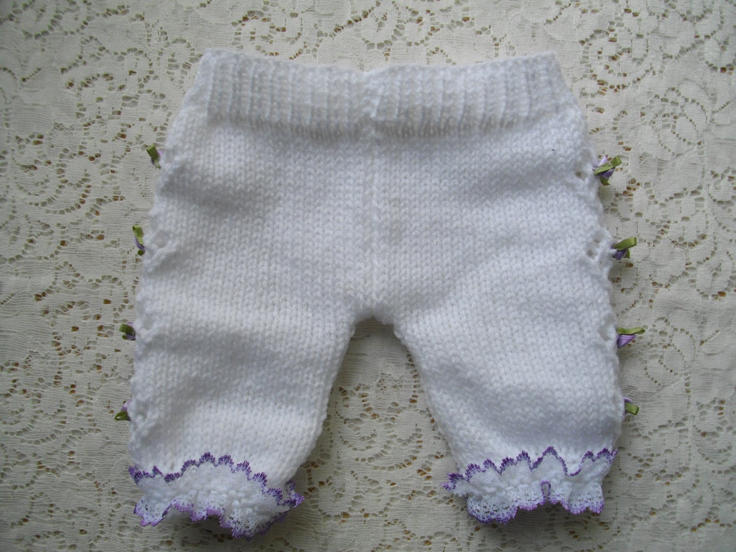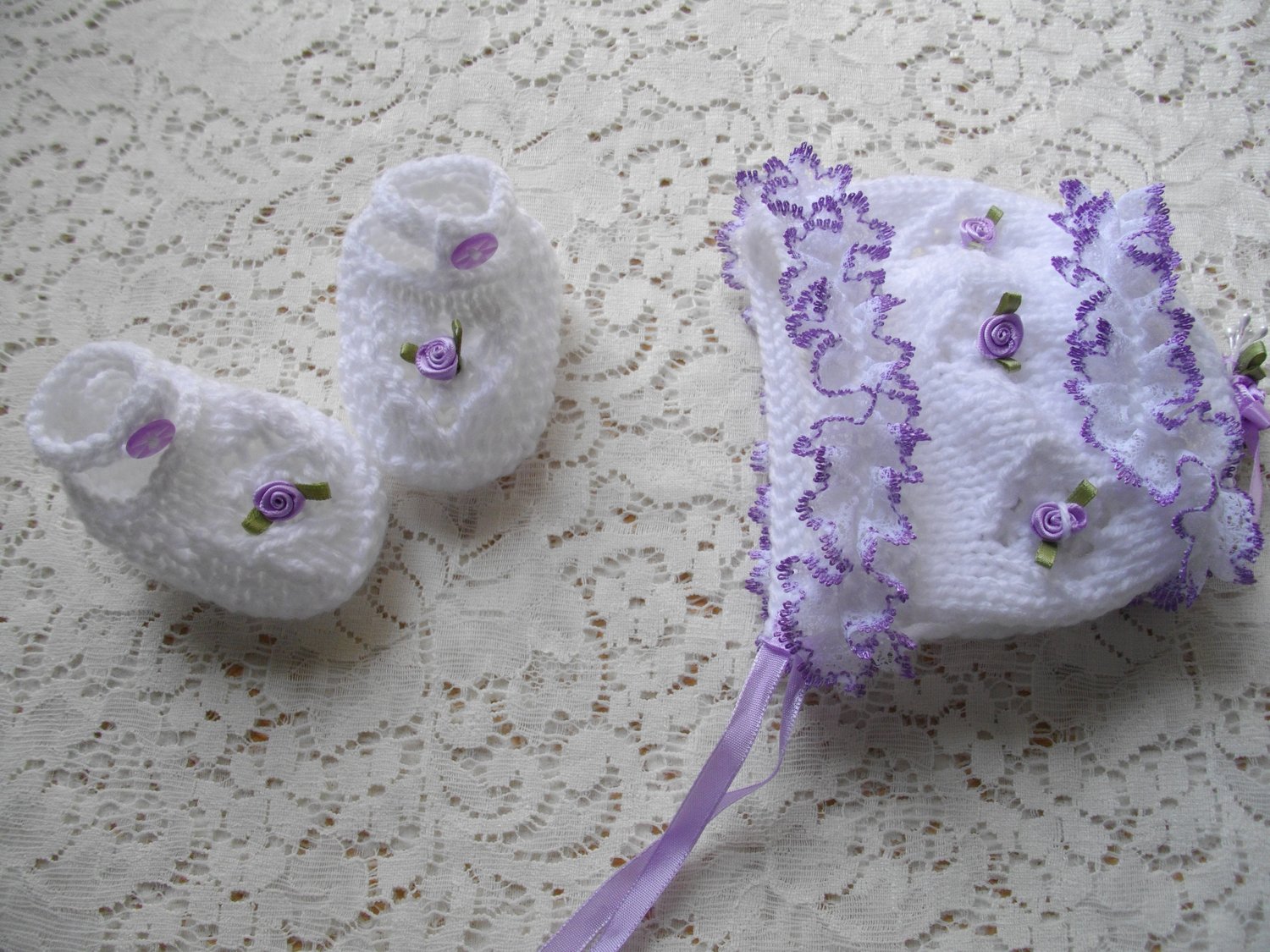 Printed instructions for a reborn or baby girl's matinee set in DK yarn. The set comprises of a matinee jacket, trousers, bonnet and shoes. They all feature a lacy diamond pattern embellished with a single ribbon rose. When knitted, the set will fit a premature baby 3-4lb or a 16 inch reborn doll. You will need 200g double knitting yarn, 3.25mm needles, 4mm needles, stitch holders, 5 metres knitting in lace, 2 metres of narrow ribbon, 37 ribbon roses, 1 triple ribbon rose, 2 small buttons for shoes, and 4 larger buttons for the jacket.