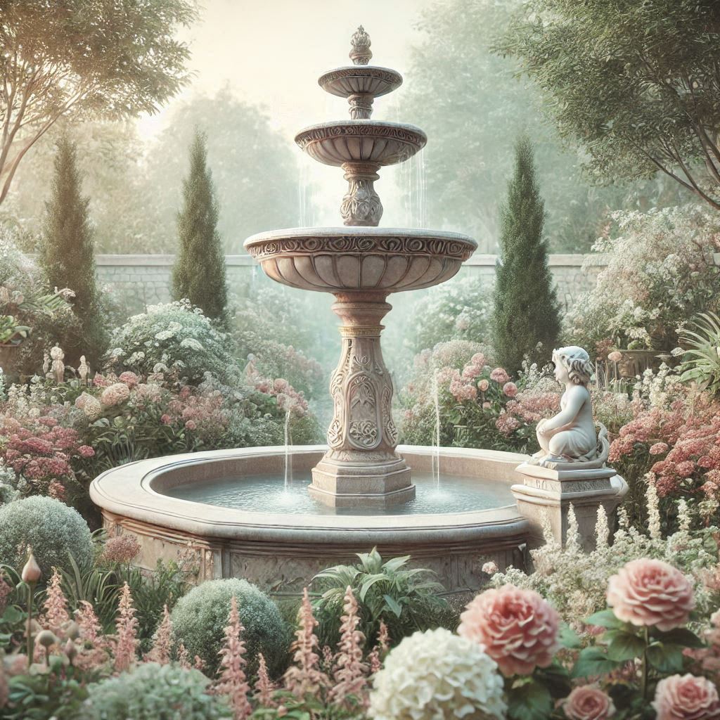 A classical stone fountain in the center of a lush garden, surrounded by delicate flowers and greenery, in a soft pastel palette, ideal for a vintage-style home.