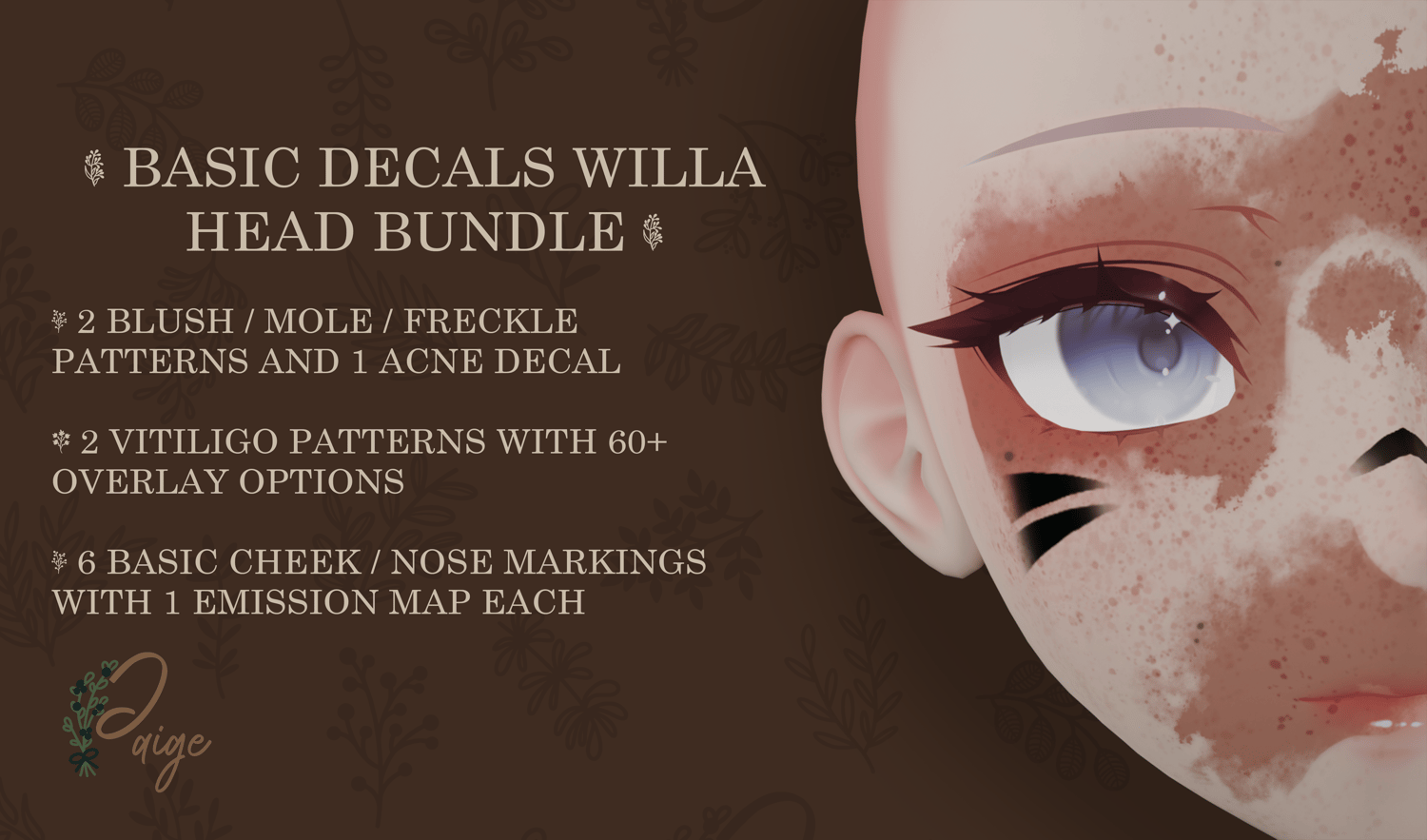 Bring your essential avatar look to life with this versatile decal bundle designed for the Willa Head. With blush, freckles, moles, vitiligo, acne, and markings, this pack gives you all the basics to mix, match, and layer for a unique style.