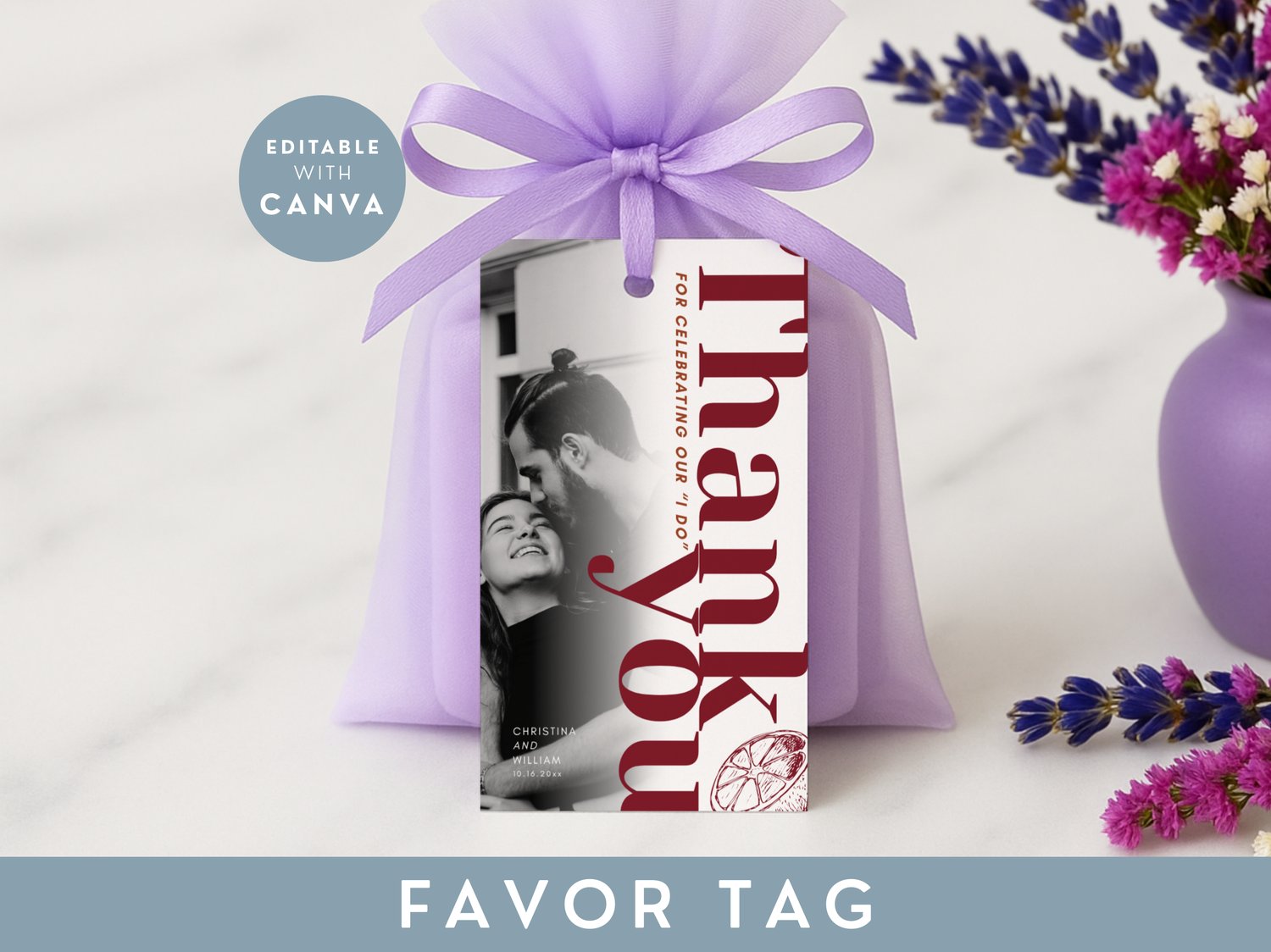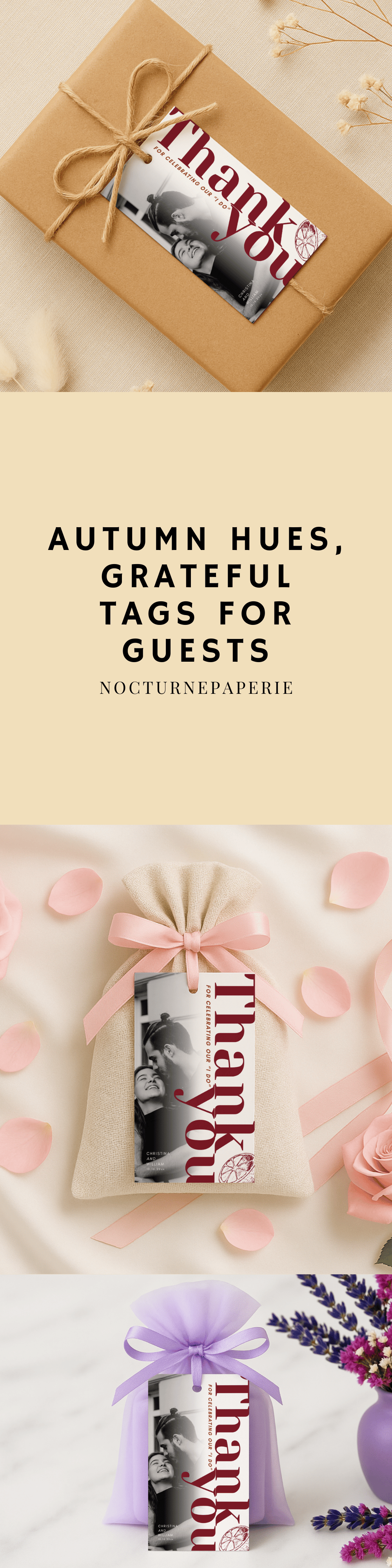 Enhance your fall celebration with this fall wedding thank you tag template for favors. The editable Canva design features a printable autumn theme tag and a custom thank you card perfect for your fall wedding. It’s part of our seasonal collection on NocturnePaperie—explore other seasons like Winter, Spring, and Summer.