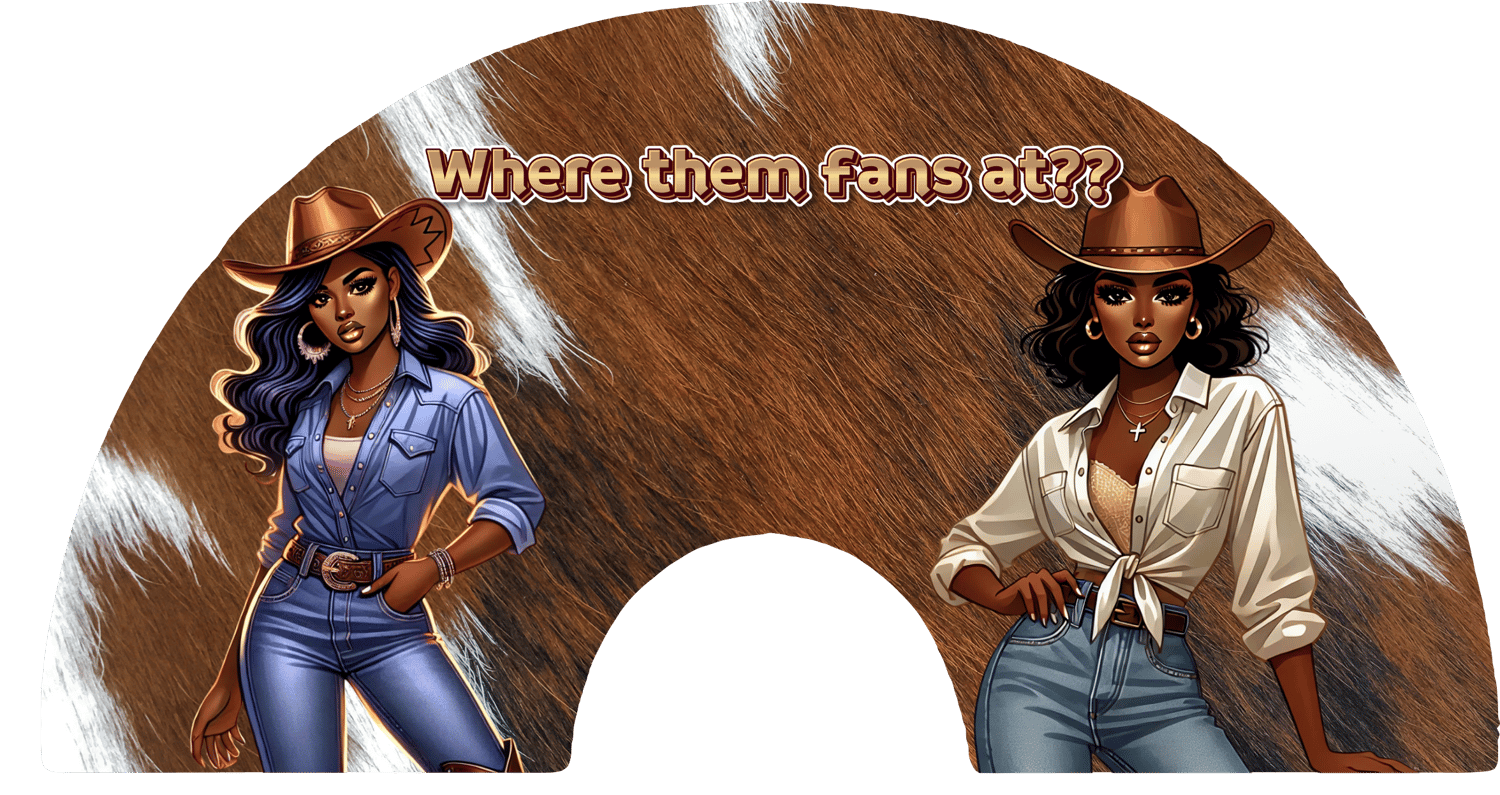 Turn heads and snatch attention with this bold and sassy clack fan featuring two stunning cowgirls serving denim, attitude, and Southern heat! Set against a rich cowhide backdrop, this half-circle folding fan brings all the Western glam with a modern edge. Whether you're at a rodeo, a music festival, or just need to make a dramatic statement, this fan delivers serious flair with every snap.
