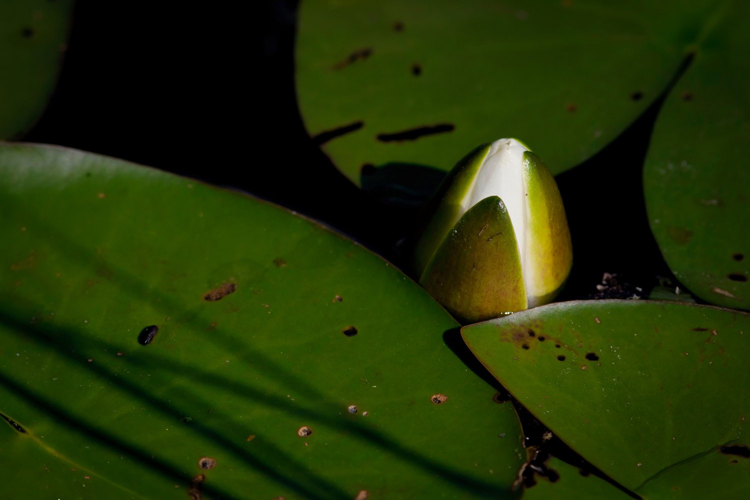 White waterlily (Nymphaea alba) blooms on the lake. The flower is just beginning to open.