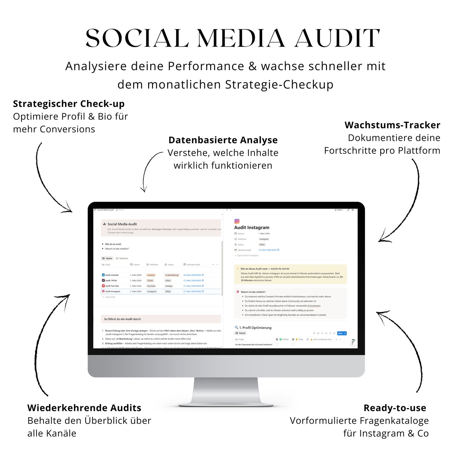 - Social Media Audit mit vorgefertigten Fragenkatalogen für monatliche Strategie-Checkups