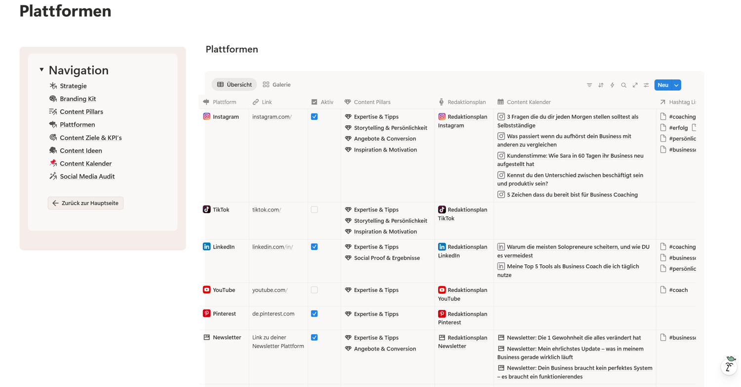- Multi-Plattform Content Kalender für Instagram, TikTok, LinkedIn, YouTube, Pinterest, Newsletter und Blog (inkl. Status-Tracking und Kalenderansicht)