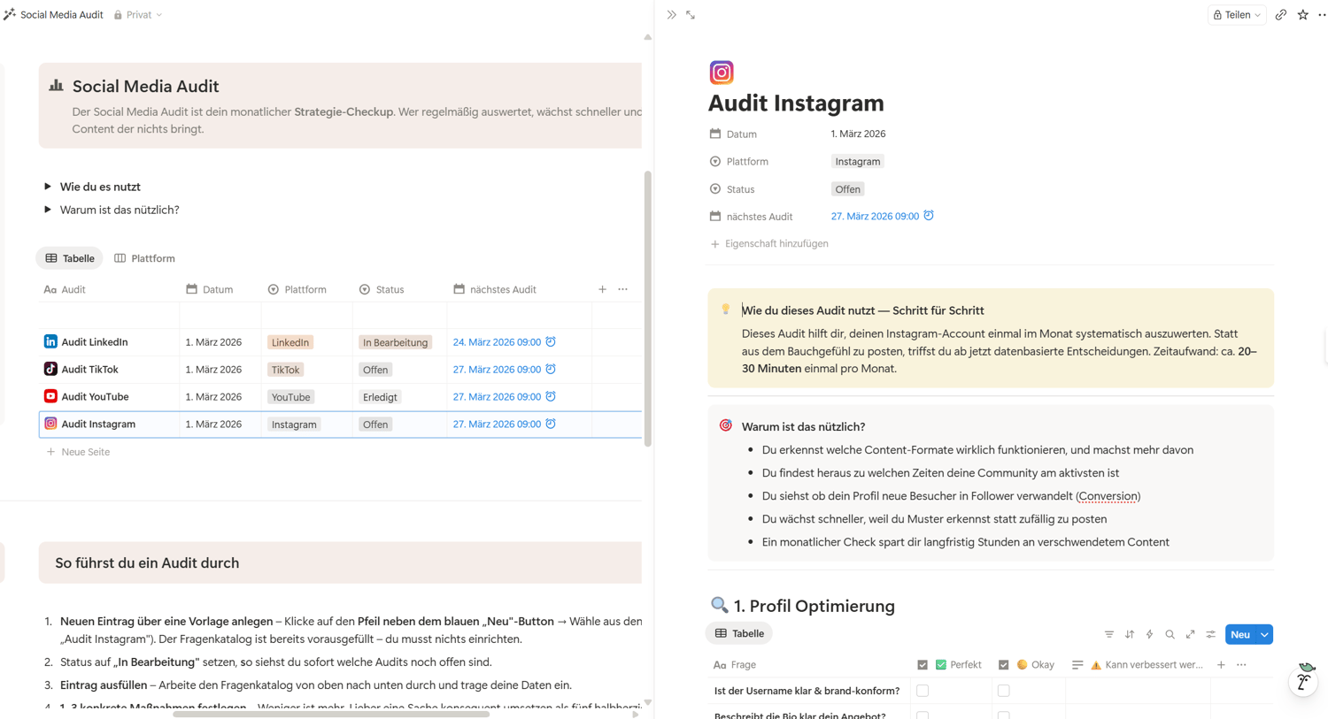 Notion Social Media Content Calendar Dashboard | Content Creator Planner & Social Media Audit Template | Instagram TikTok Planner DEUTSCH