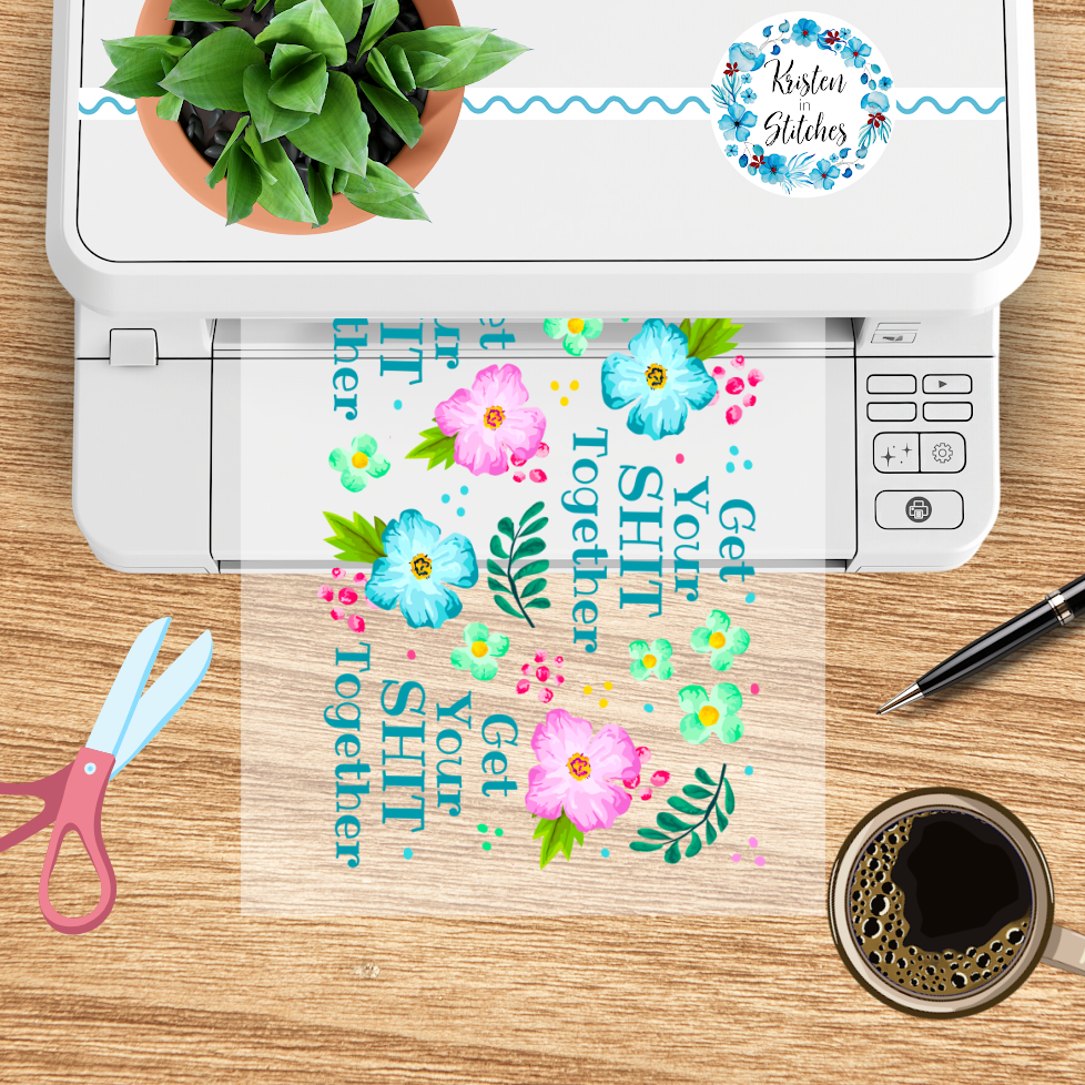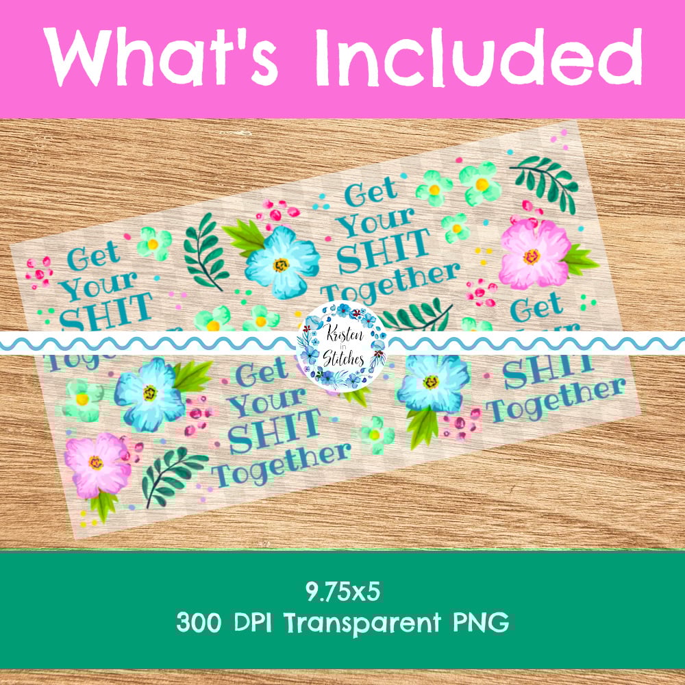 The design features a "Get Your Shit Together!" sarcastic saying with pink and blue flowers.