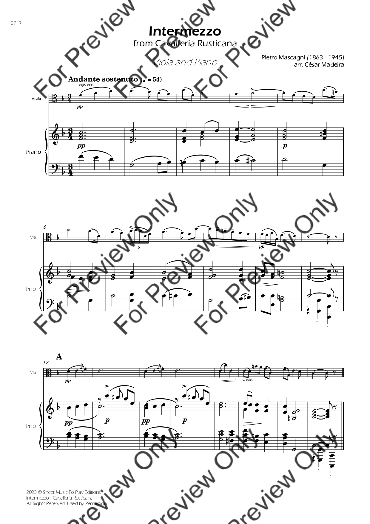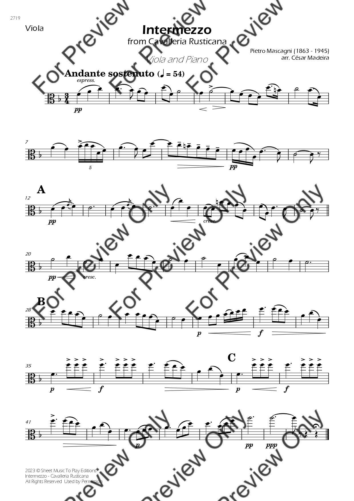 Intermezzo from Cavalleria Rusticana by Pietro Mascagni. Arrangement for Viola and Piano. With Full Score and Individual Parts. Have fun!