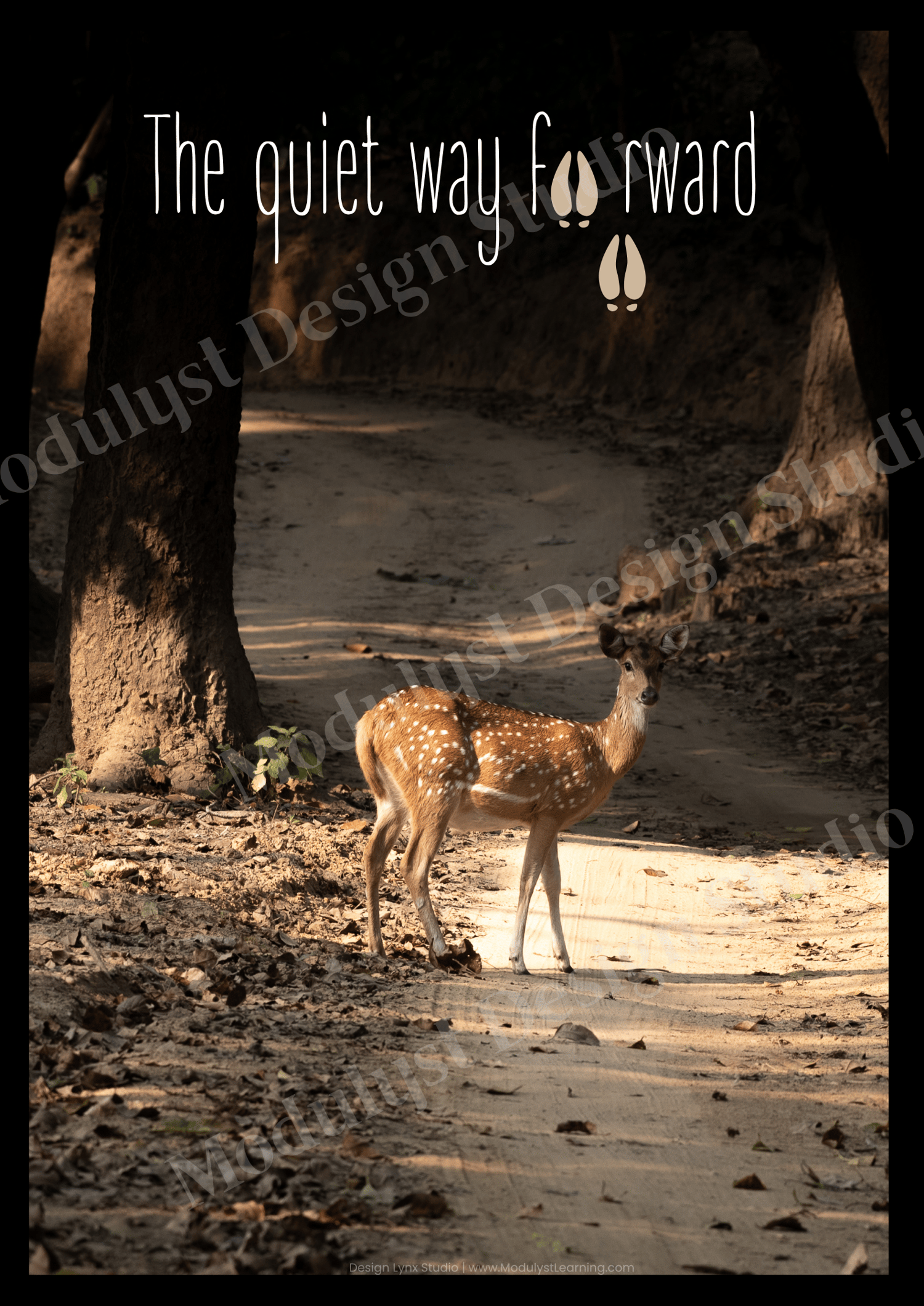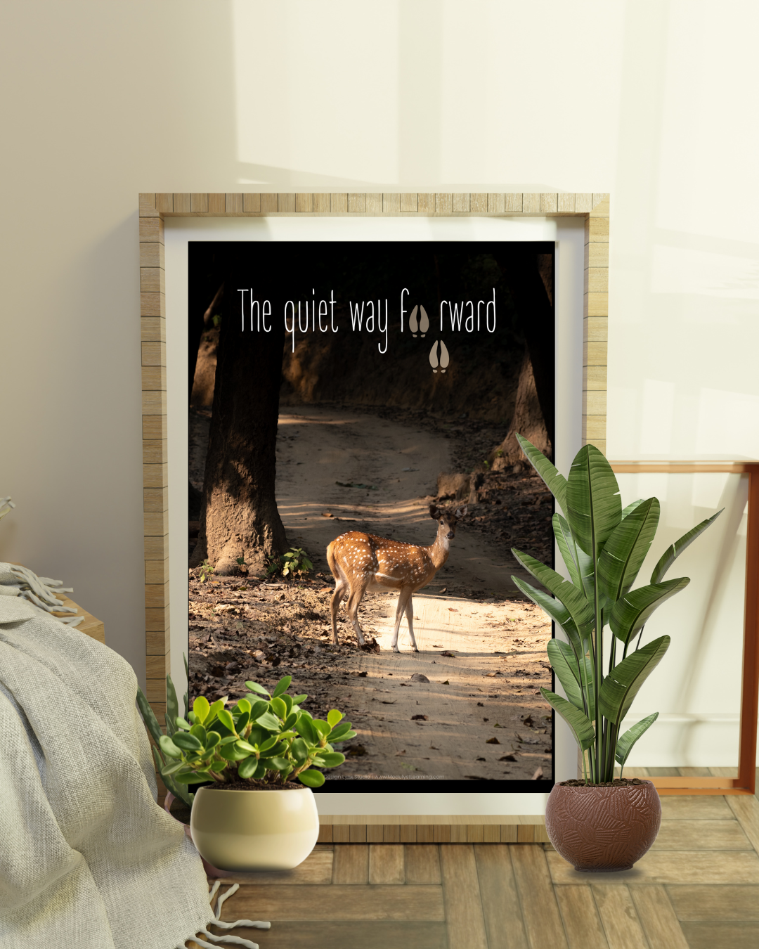 Step into a moment of profound tranquility with this captivating A2 poster that captures nature's gentle wisdom in its purest form. A solitary deer stands gracefully on a dappled jungle path, embodying the art of moving through life with quiet confidence and mindful presence.