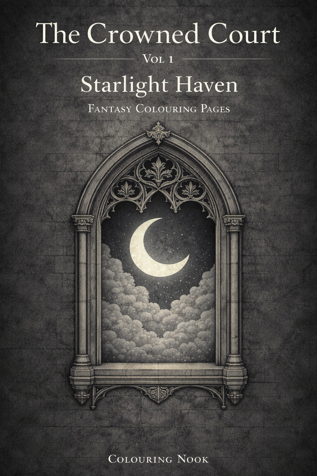 This dark fantasy colouring collection features elegant, gothic-inspired illustrations designed for calm, immersive colouring sessions. From crowned figures and ceremonial goblets to throne rooms and arched windows beneath the night sky, each page invites you into a world of stillness, power, and imagination.