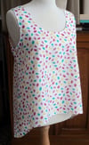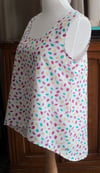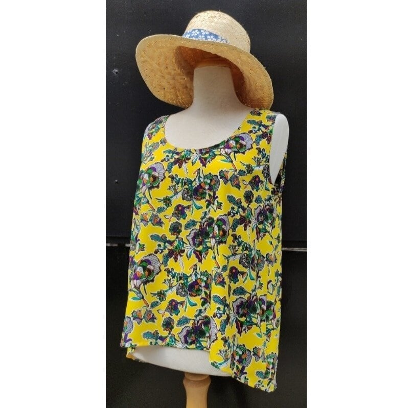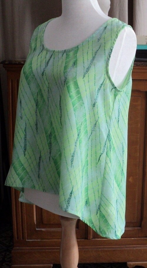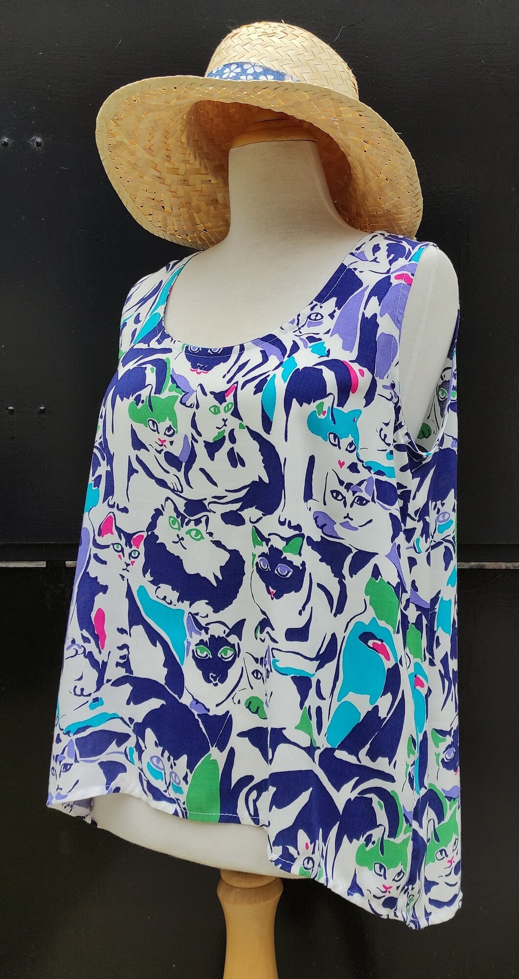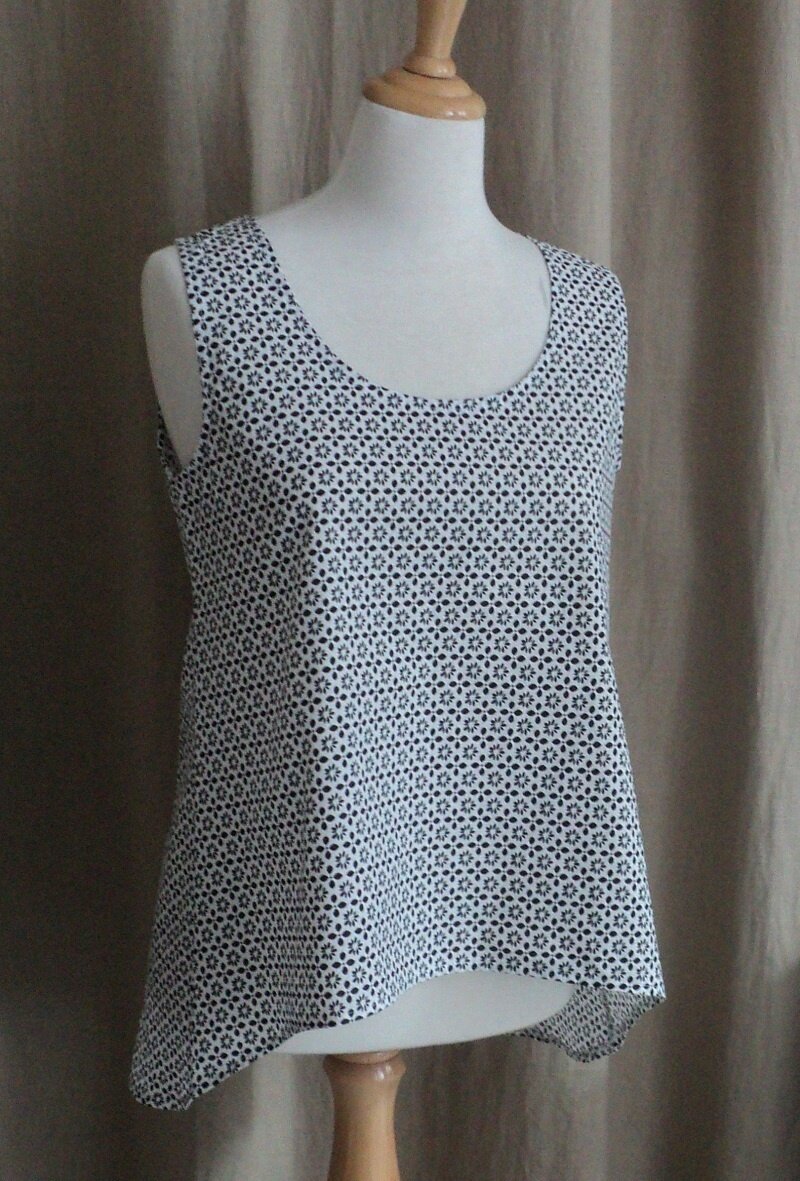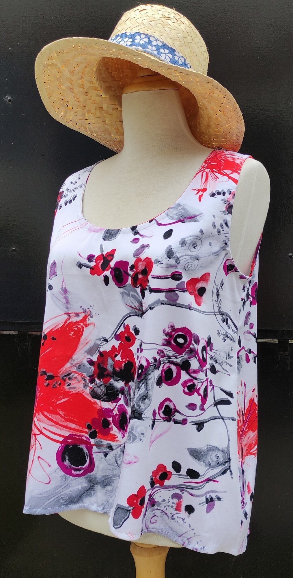 Blouse dans un tissu léger idéal pour les beaux jours ! Modèle plus court sur le devant et de la longueur dans le dos, ample et sans manches.