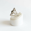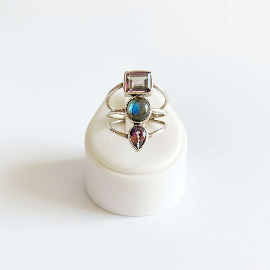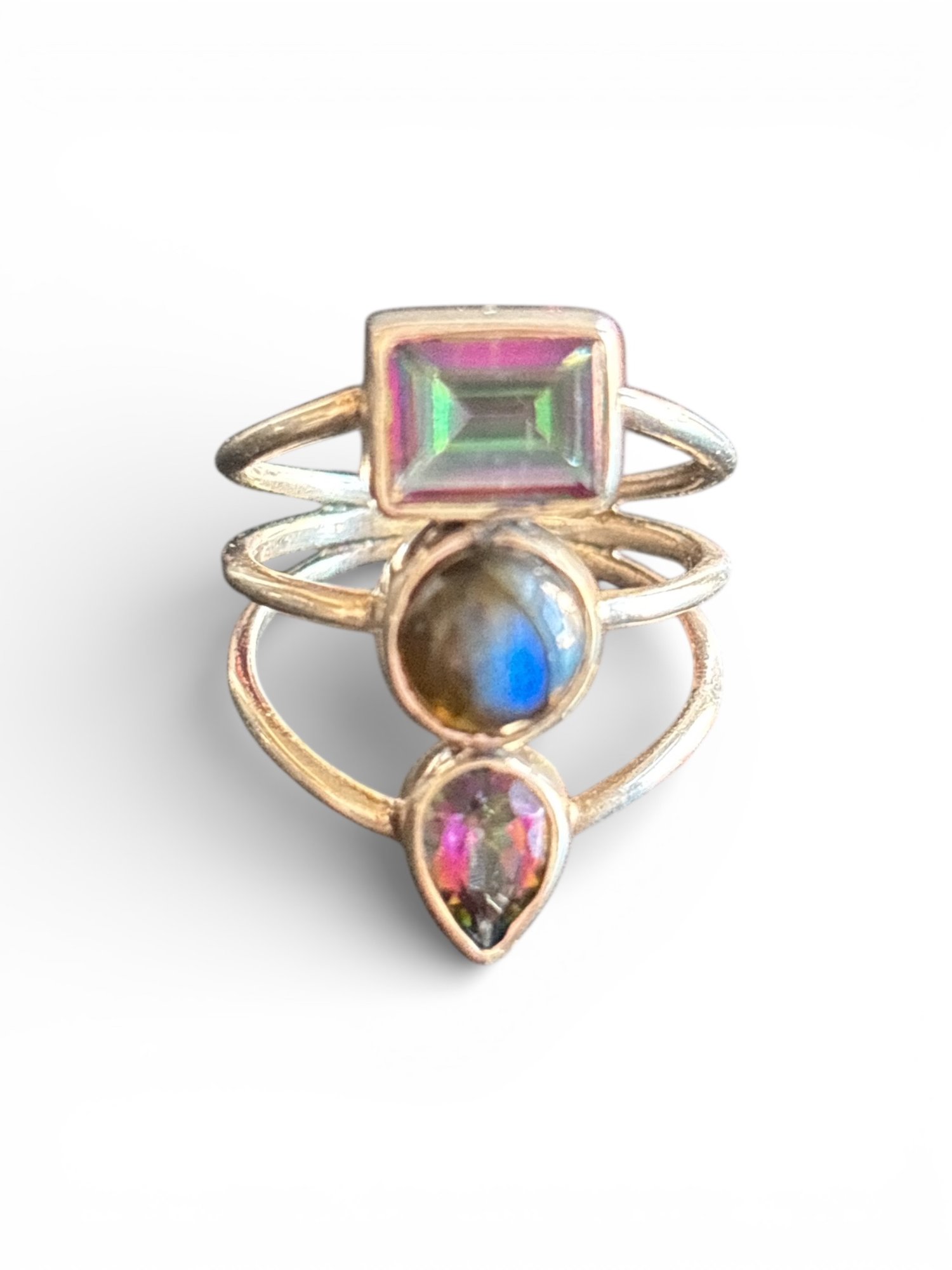This striking sterling silver ring features a modern open-band design showcasing three beautifully set stones in a vertical composition. The design highlights a rectangular faceted crystal with an iridescent finish, a luminous oval cabochon with blue flash, and a teardrop-shaped crystal with rainbow tones. The layered silhouette creates a bold yet elegant statement with an artistic, contemporary feel.