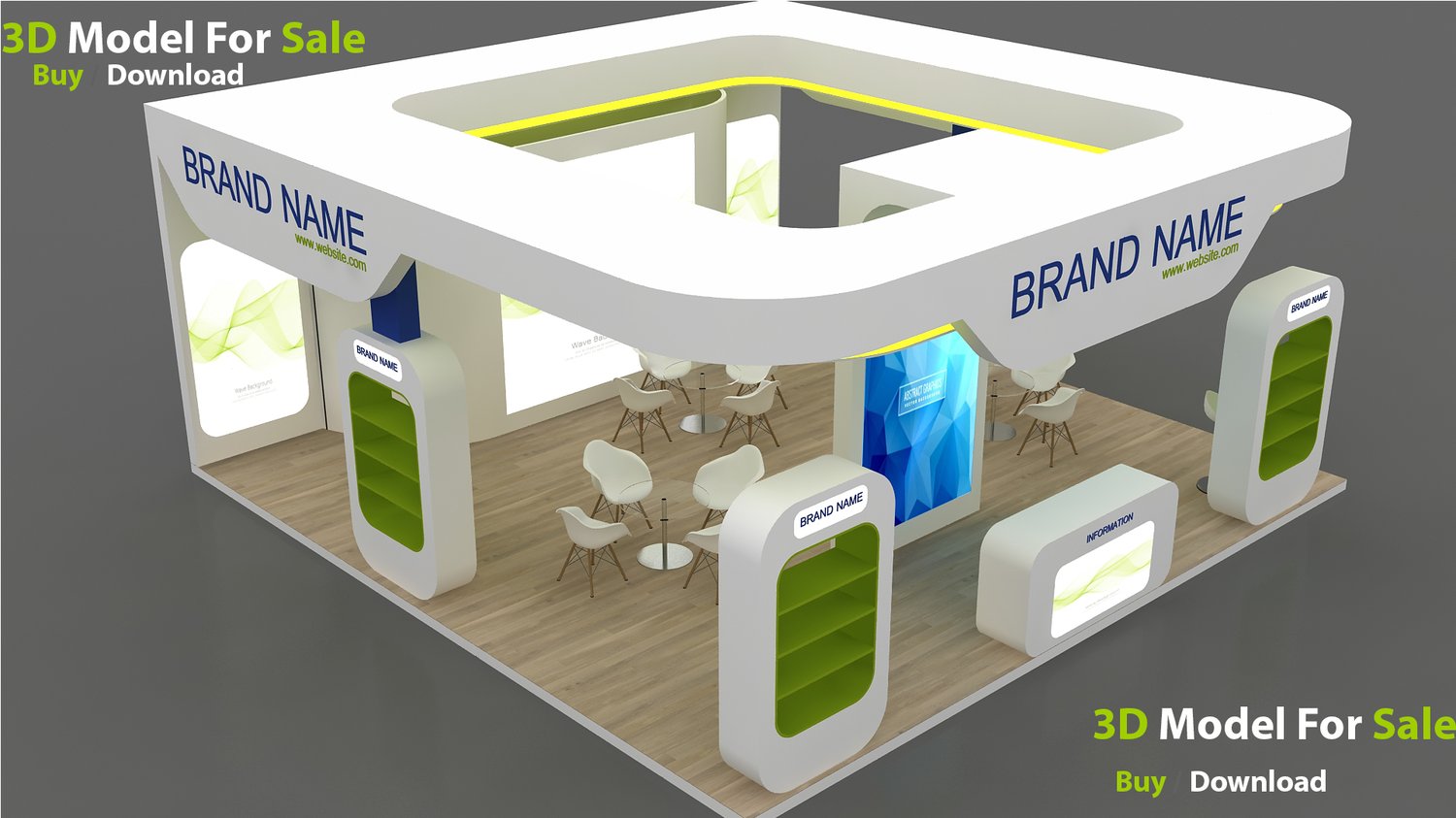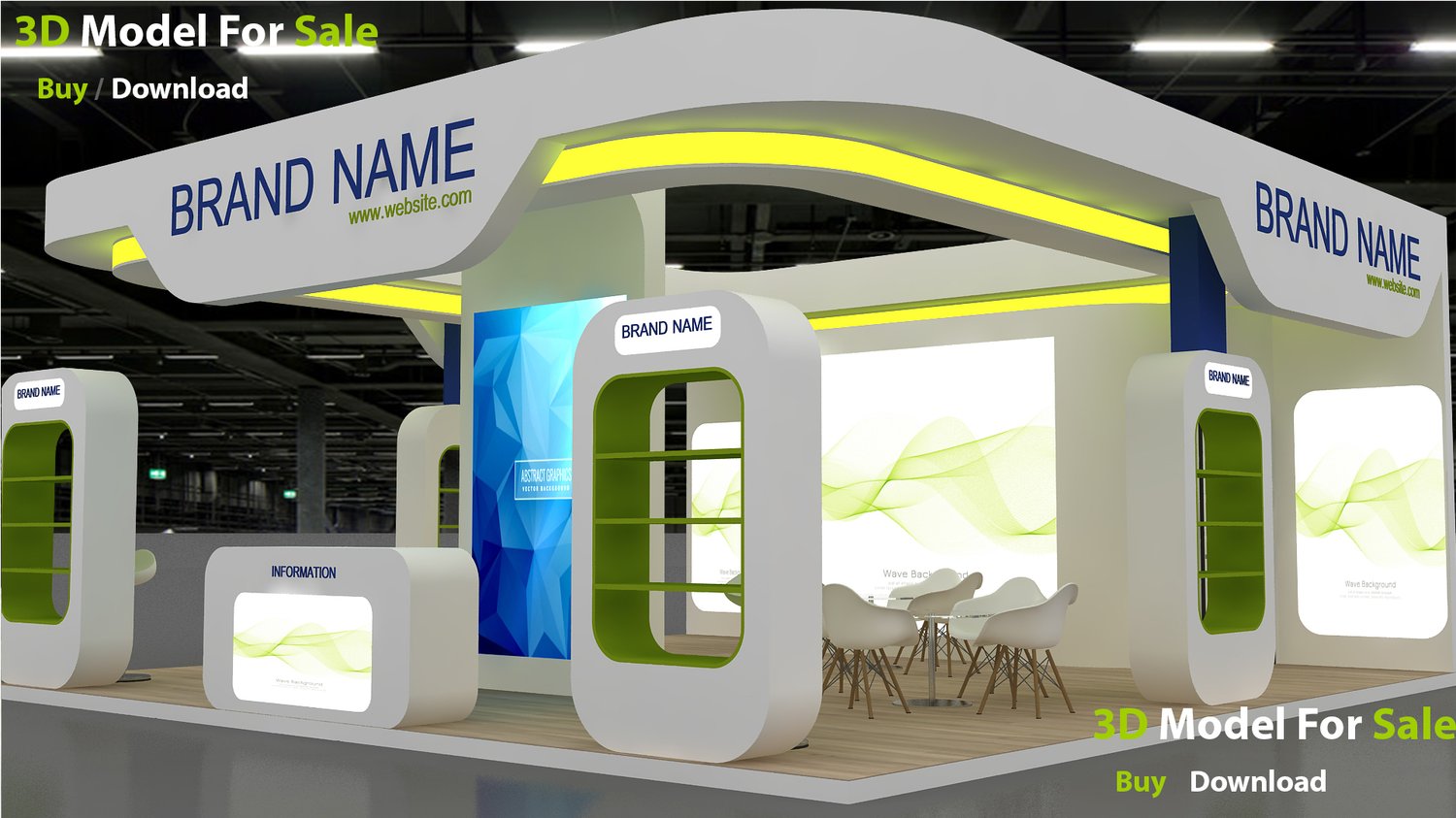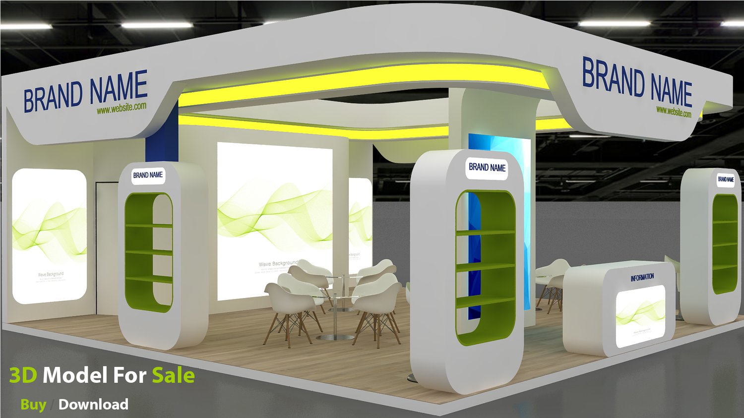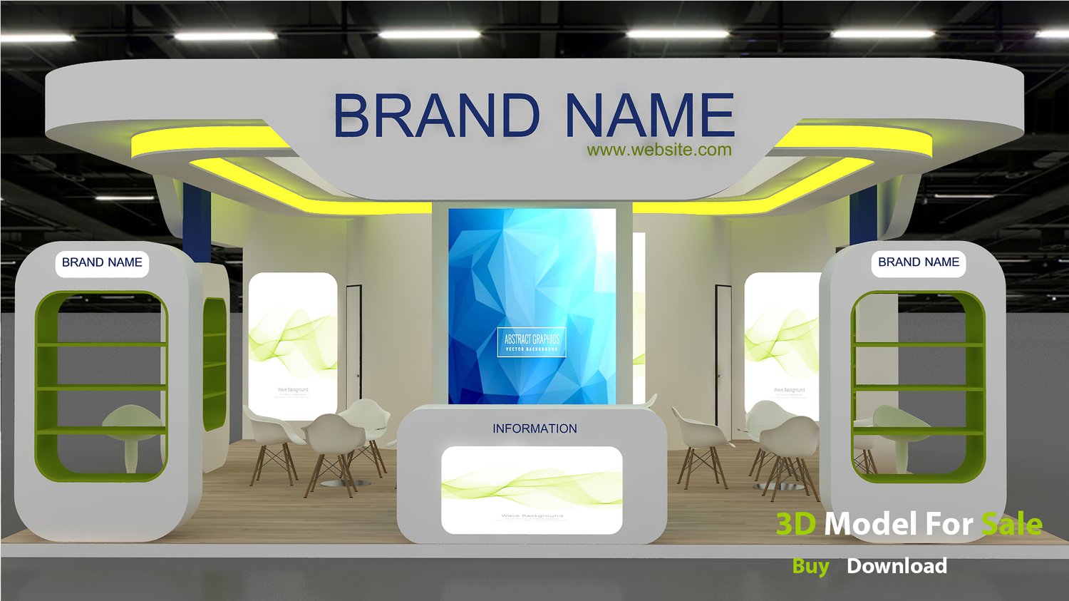 include design all necessary area in Exhibition and Booth Such as Vip and Storage and Counters and also Stand for productsFormat: max (all version from 2016) / FBX /OBJ/Glb and Also Blender