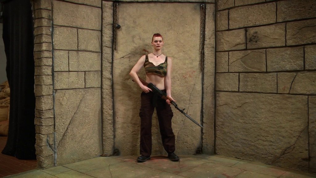 Combat girl Saphyra killing several clones of Bikini girls in highheel boots.
