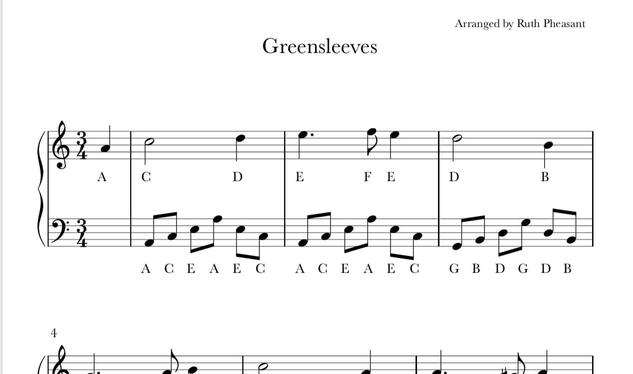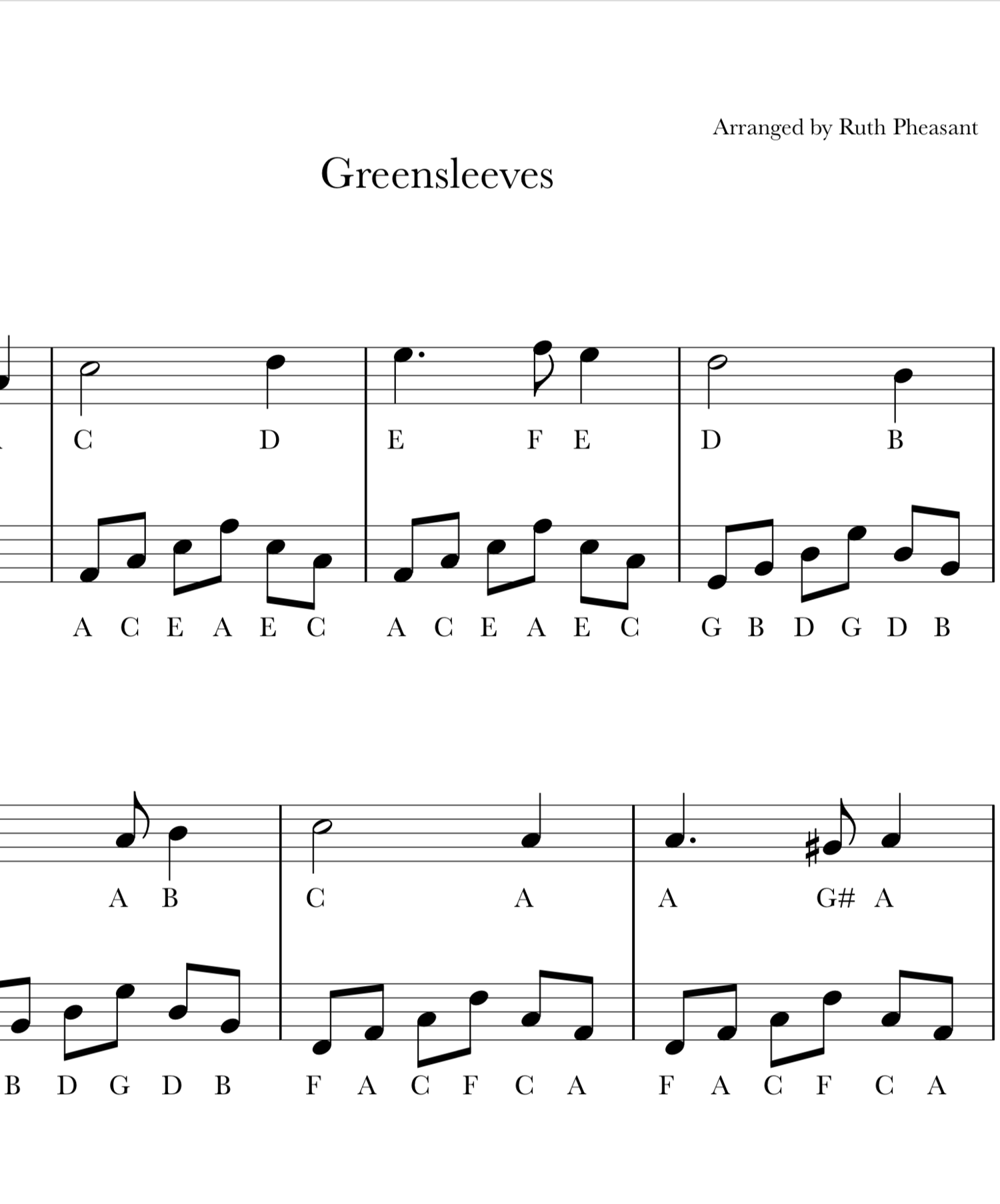 My own arrangement of Greensleeves for piano. One of the PDFs is the sheet music with letter names on every note, the other PDF is the same music without letter names. This is so that you can test yourself and gradually get better at reading music.
