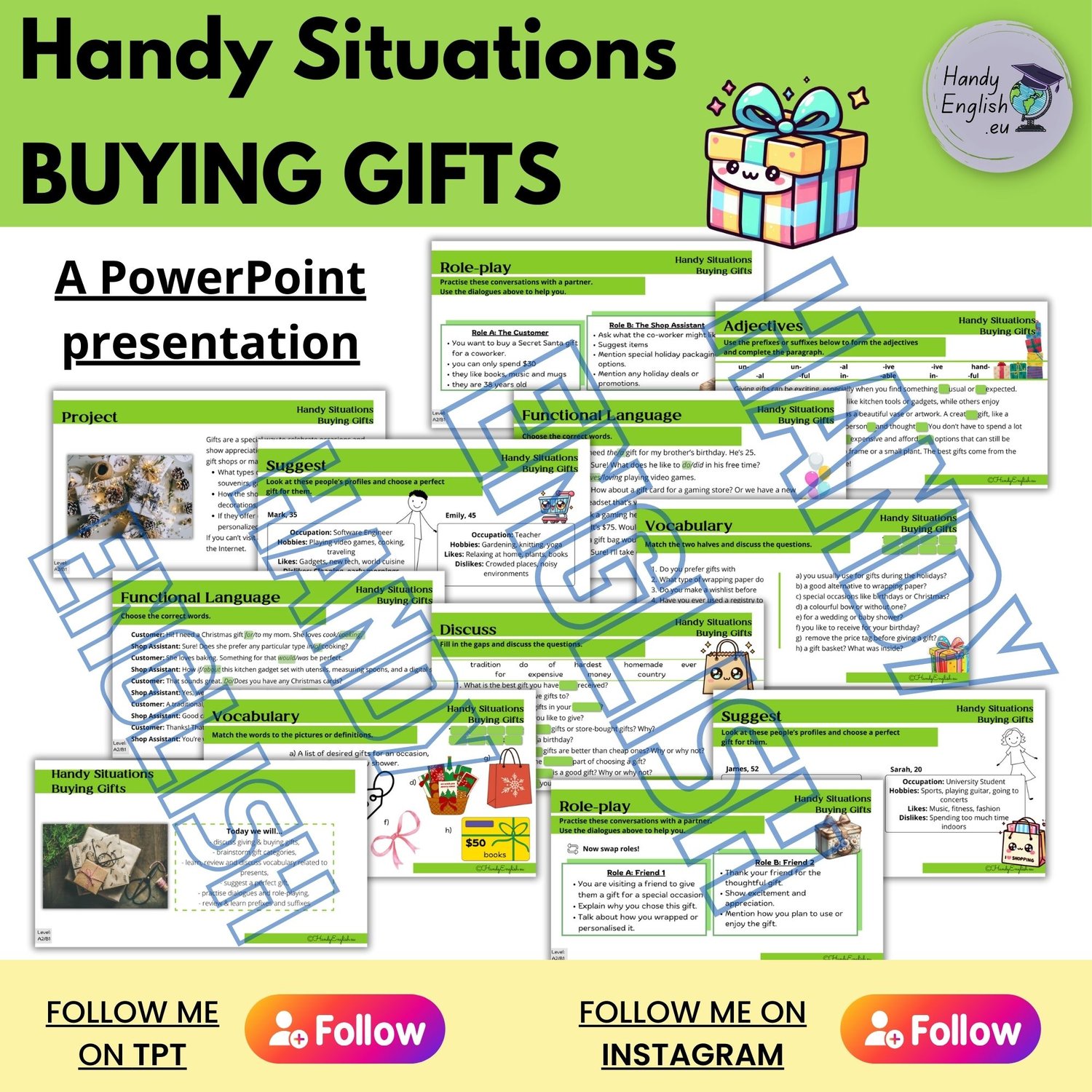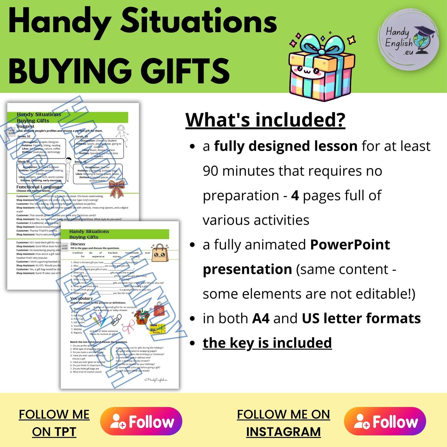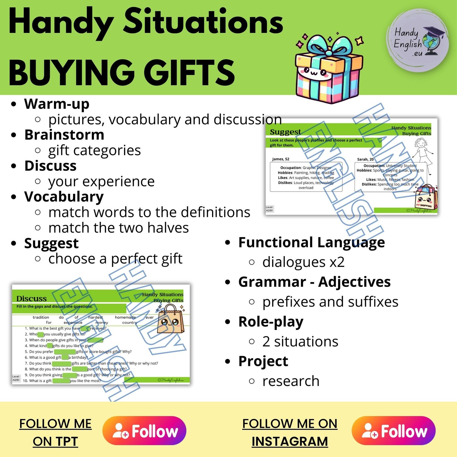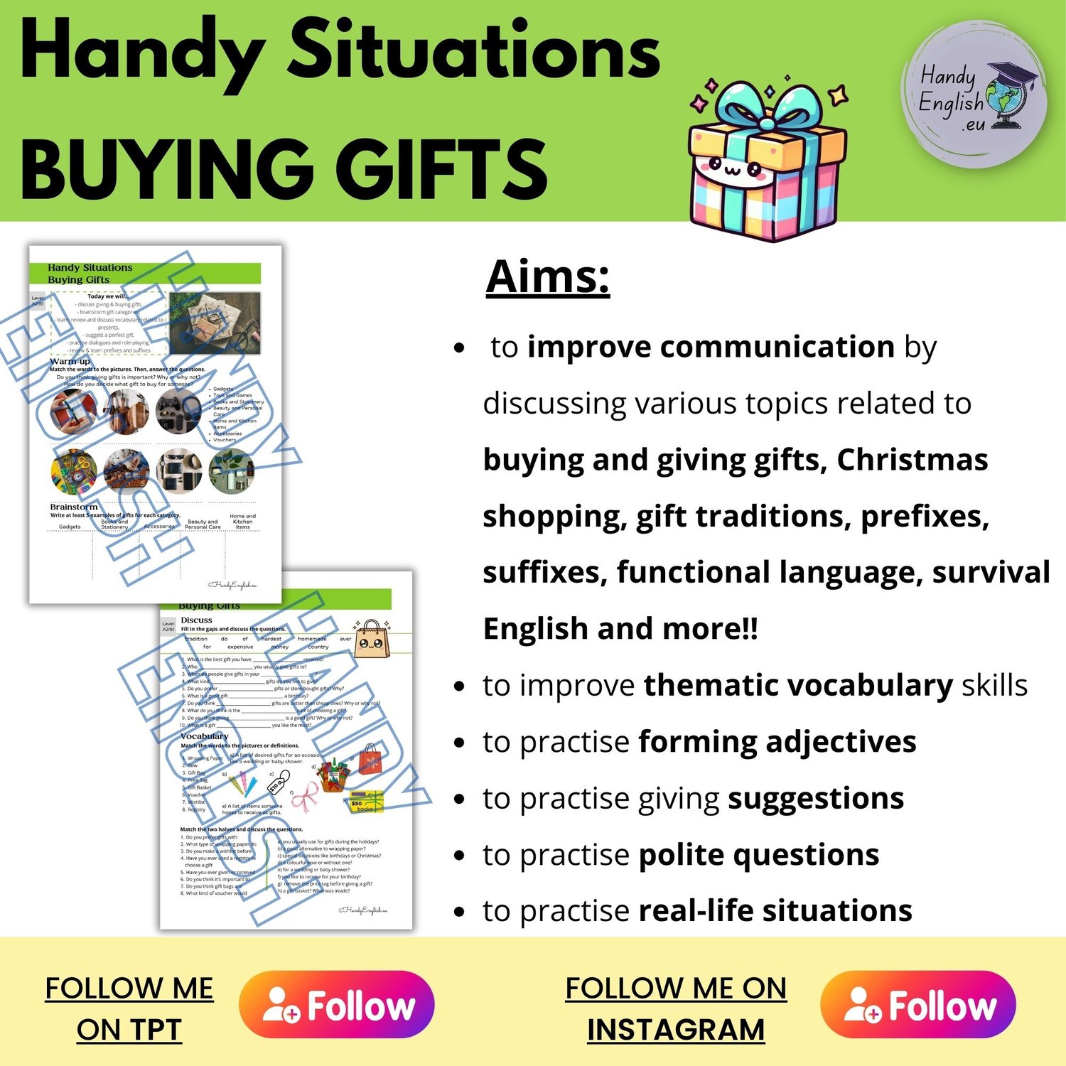 - to improve communication by discussing various topics related to buying and giving gifts, Christmas shopping, gift traditions, prefixes, suffixes, functional language, survival English and more!!